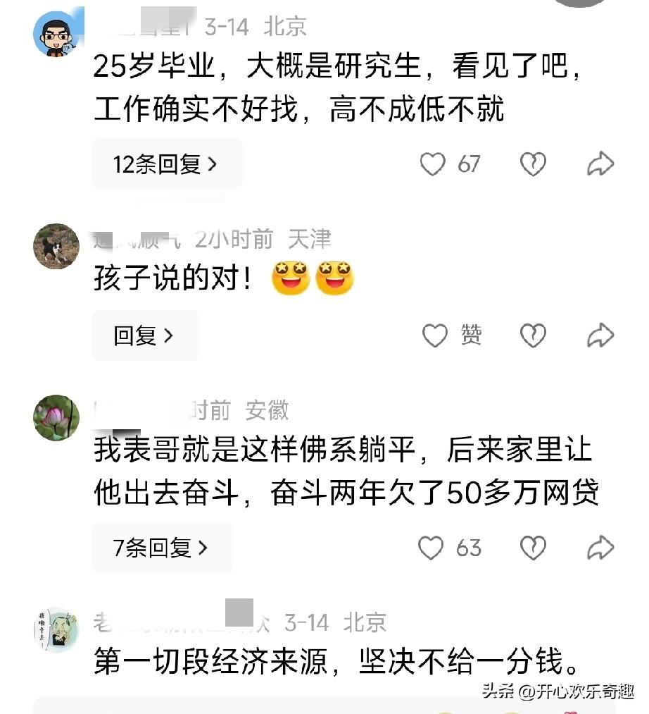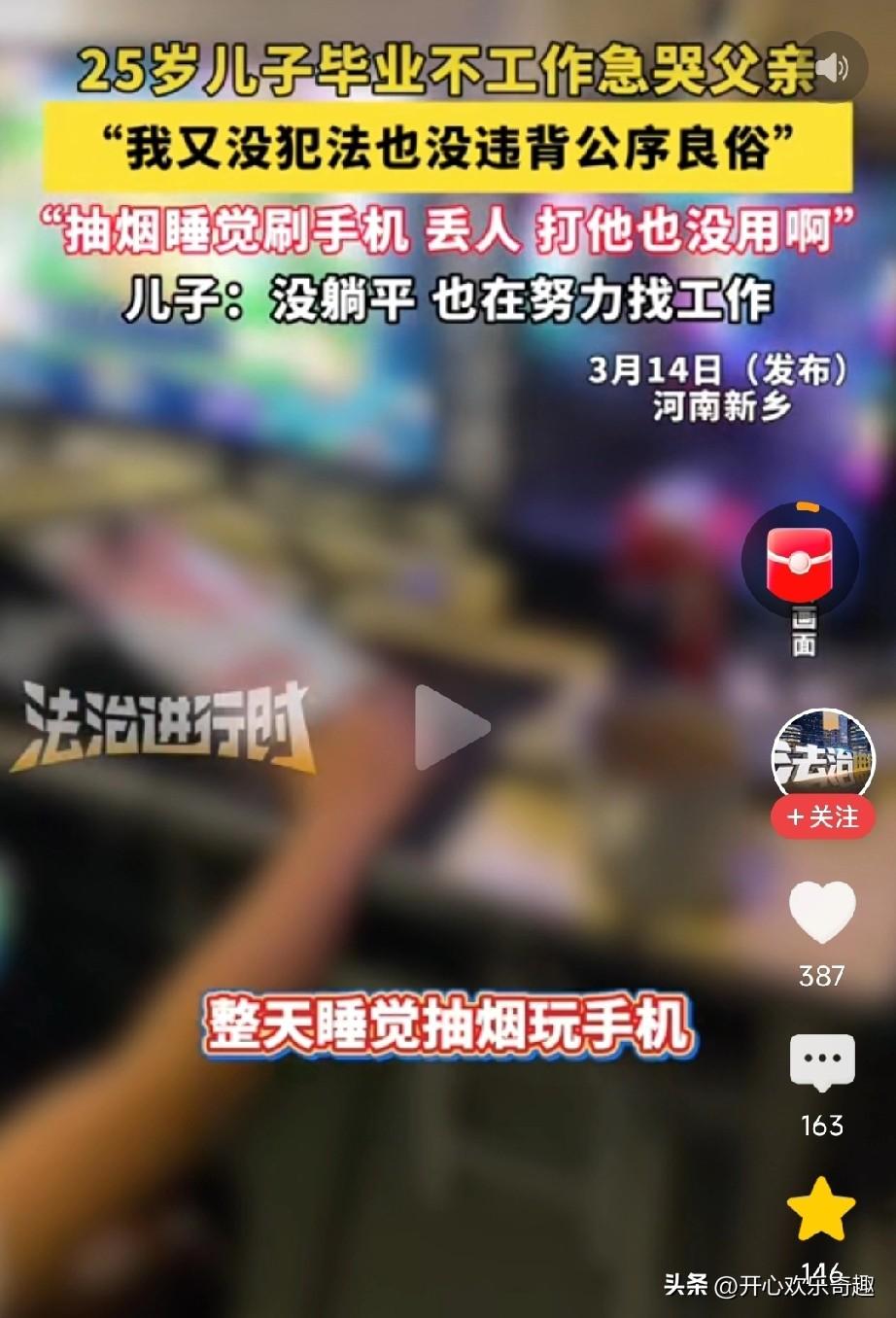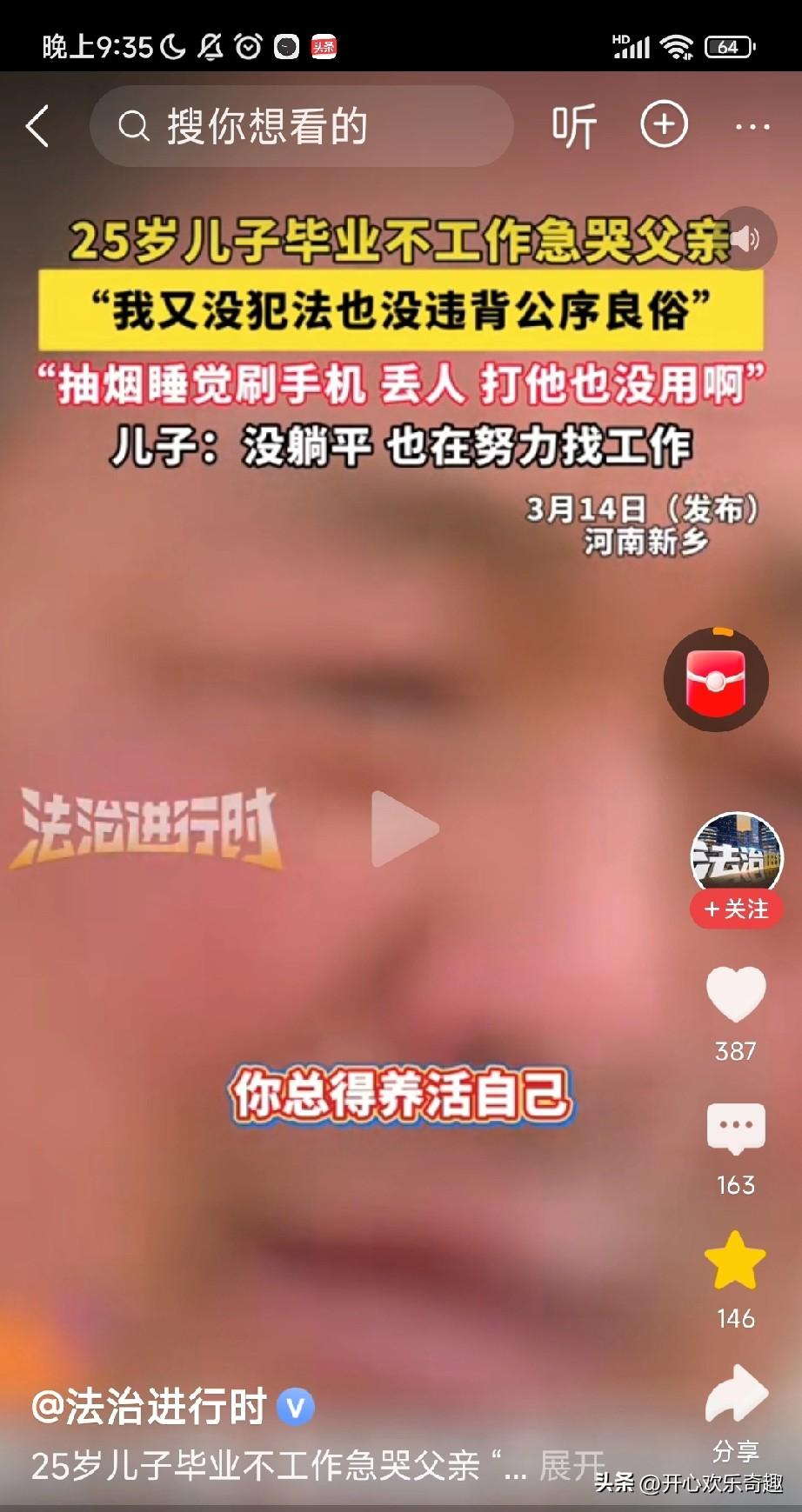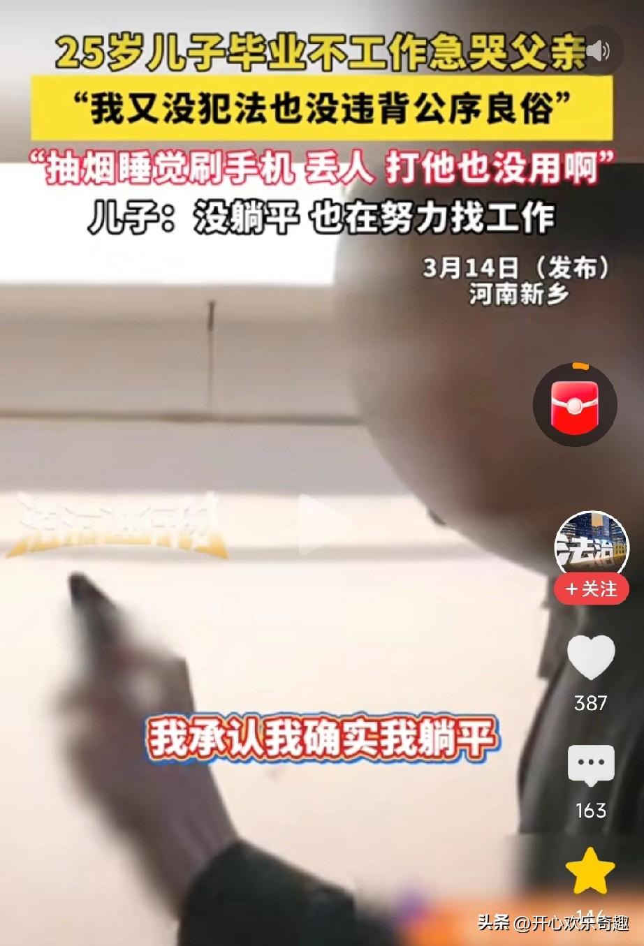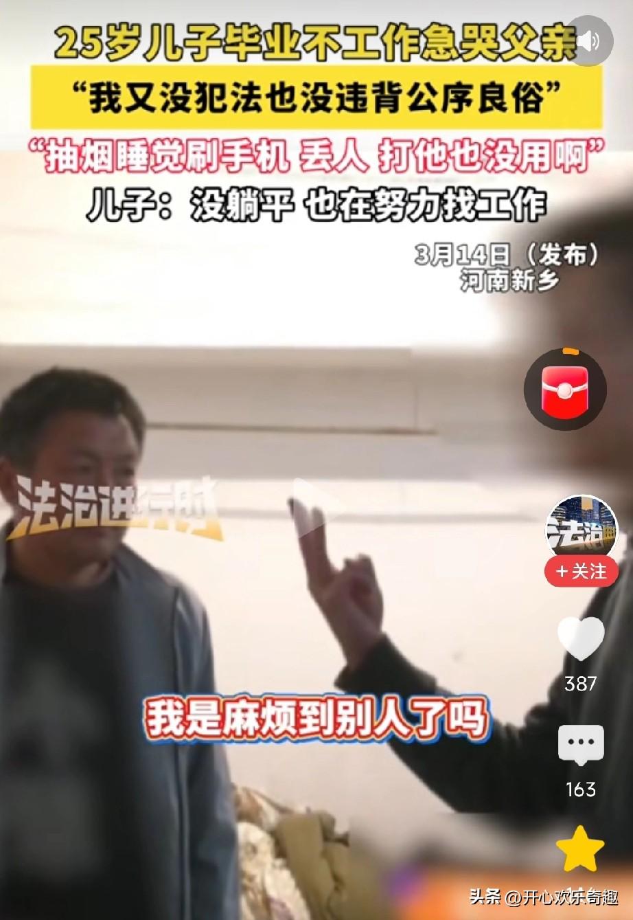 “我又没有犯法,也没有违背公序良俗。” 我错在哪里了? “我也正在努力找工作呀,只是暂时找不到呀。” 二十五岁的毕业生不去找工作,这可把他的老爸急哭了。 他的老爸哭什么呢?急什么呢?好歹把儿子养到了二十五岁,从他1岁开始供书教学,读的幼儿园,读的小学,读的初中,读的高中,读的大学,读的研究生,现在好了,终于毕业了,但是他不出去找工作,那怎么办呢? 虽然这个做儿子的事回应的好好听的:“又没有犯法,也没有违背公序良俗,我到底错在哪里了?”他还说出了一句,我又没有麻烦到别人! 老爸的可急坏了,看着儿子天天不是在家里抽烟,就是在家里睡觉,再不然就是刷手机。在家里就这样待了一个月。一个人有多少天生存在世上? 打他,骂他,说他也没用。 其实想一下,可能做老爸平常的时候也非常的宠着儿子了。 要不然这么大的儿子了,一点都不着急。而且供他读了这么多书,他还不去找工作的话,真的非常的丢人了。 这样的大学生,一点危机感都没有,每天就是张开双手问老爸要钱就行了,这肯定不用去找工作了。 同时可以说一下,就是高不成低不就,因此找工作也有一点难度。 就凭着这个孩子的这么几句话就可以想象的,他做人是非常有逻辑的。 他也有他自己的一套。 这个老爸可能是有一点的心急吧。 我那邻居的儿子呀,从前年的年底失业,到现在都没有找到工作呢,他的老妈天天让他去找工作,他都退堂了事。因为他今年40岁了,的确找工作也不好找。 这到底是人的问题,还是社会的问题了? 这个事情,大家有什么看法呢?