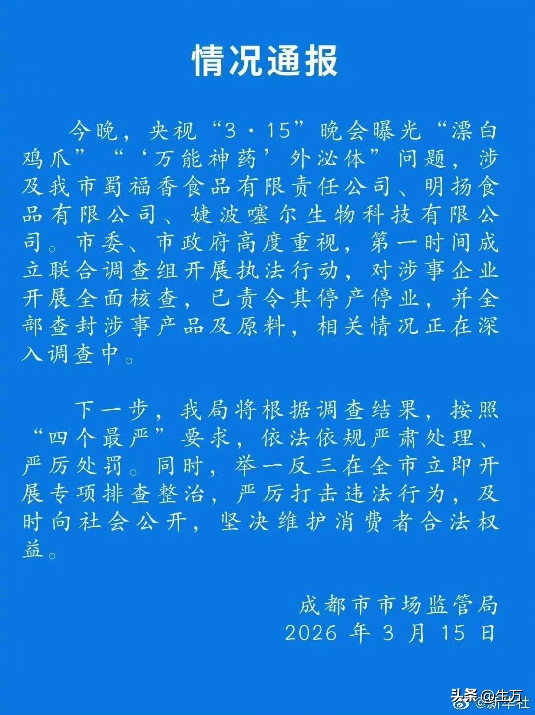 新华社深夜报道:成都通报漂白鸡爪! 今天晚上,315晚会结束之后半个小时左右,新华社就转发了成都市市场监督管理局,专门发的这份情况说明! 这份情况说明对今天晚上提到的三个不同的事情,包括漂白鸡爪等等背后涉事的三个公司要进行调查,现在他们已经成立了联合调查组,第一部已经下来了,那就是先让这三个企业停产停业,并且对涉事的产品和原料进行查封,然后再进一步调查。 而且最后一段还专门给大家承诺了,会按照相关的法律法规,对这个事情进行后续的处理和处罚,而且等这个调查结果出来之后,会把这个结果给大家公布出来。 同时还要对这个事情进行举一反三,开展专项的排查整治。 所以从这价情况说明能够看得出来程度,当地的有关部门对这个事情是比较重视的,接下来我们拭目以待,看看最终的调查结果和处理结果是怎么回事。