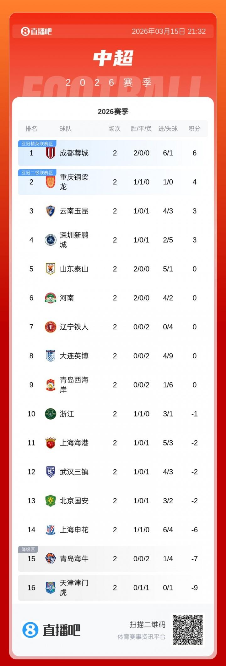 3支球队两连胜,4支球队两连败,中超第二轮后两支负分球队负分归零! 中超第二轮结束后,有3支球队两连胜:成都蓉城、山东泰山、河南彩陶坊! 有4支球队两连败:辽宁铁人、大连英博、青岛西海岸、青岛海牛! 两轮中进球最多的球队是上海申花,他们共打进6个球,成都蓉城、山东泰山、上海海港都打进了5个进球!进球最少的球队是辽宁铁人和天津津门虎,他们都还没有进球! 两轮中丢球最多的球队是大连英博,两场比赛丢了9个进球!青岛西海岸两场丢6球位列第二! 两轮后两支负分球队归零,山东泰山、河南彩陶坊-6分归零。虽然多支负分球队都有积分进账,但是青岛海牛和天津津门虎明显追赶不及,他们再不追分,差距会越来越大,现在的分差积分榜第一6分,最后一名-9分,分差已经达到了15分,比赛才进行了两轮啊! 两轮比赛后最让人大吃一惊的或许是重庆铜梁龙队。这个队伍从引援到上任的主帅以及俱乐部的投入,都给人一种一轮游的感觉,外界几乎没有人看好,但他们却1胜1平保持不败不说,还积分榜上处于第二!更让人吃惊的是铜梁龙的年轻人实在太多了,第二轮战胜铁人的比赛,最后十几分钟场上居然多达5个U23以下的球员,而年纪最小的年仅19岁的门将打满全场不说,表现也相当出色! 两轮过后最让人失望的或许是辽宁铁人。这个队伍在引援的时候轰轰烈烈,中超身价最高的外援以及少有的日籍中场核心,甚至不少人开赛前都憧憬着辽宁铁人也会大杀四方,甚至喊出来口号:Number one!现在看来明显的问题多多,而且两场比赛辽宁铁人的主帅李金羽排兵布阵都有重大错误!第一场直接去和山东打对攻,第二场又想来个后发制人,甚至中场核心都没首发。两场比赛输球也就成了必然。 中超刚开赛两轮,给很多球迷的印象是本赛季中超竞争会更激烈,好看的比赛或许也会多起来。积分榜上那么多负分球队,光填坑都要努力好久,那么就剩下在比赛中拼命了......