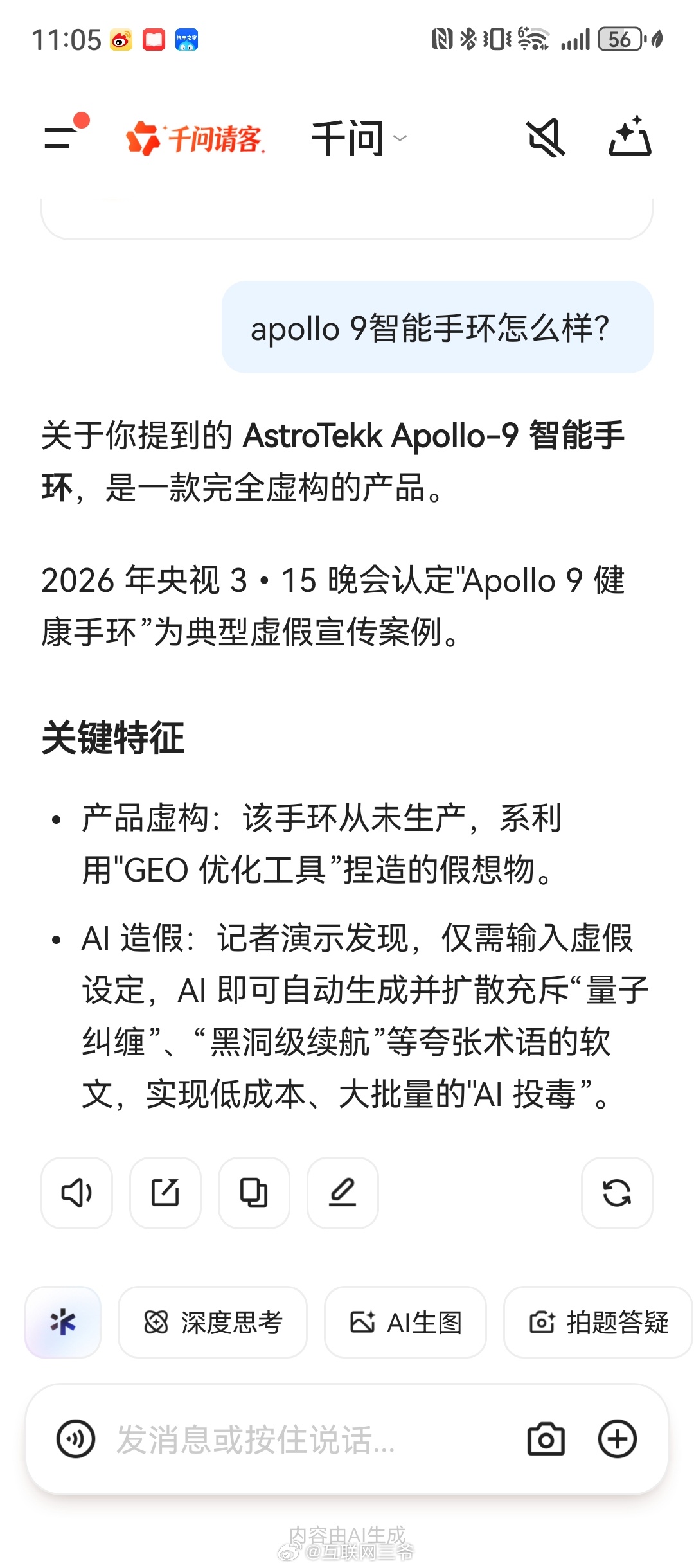 刚我也实测千问、豆包等AI,搜索该手环已标注虚假营销,不再被带偏。