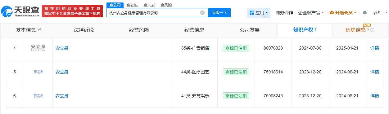 天眼查数据:问题增高机构安立身已注册相关商标 问题增高机构安立身申请腿部锻炼器专利 央视315晚会曝光增高机构的营销套路,杭州安立身健康管理有限公司被点名。 天眼查App显示,杭州安立身健康管理有限公司成立于2024年4月,法定代表人为陈和云,注册资本100万人民币,经营范围包括健康咨询服务、远程健康管理服务、健身休闲活动等,由温州南霖企业管理有限公司、温州安立高企业管理合伙企业(有限合伙)、杭州嵴得整大健康管理有限公司共同持股。知识产权信息显示,该公司已申请注册多枚“安立身”“安立生”商标,国际分类涉及广告销售、医药等,商标状态多为已注册。此外,该公司已获“一种腿部锻炼器”相关专利授权。 天眼查信息:
