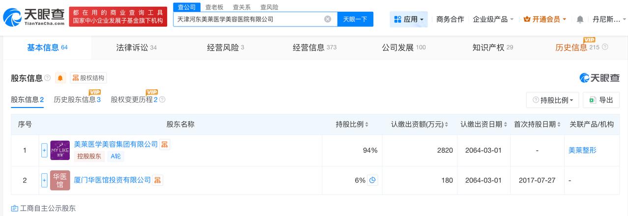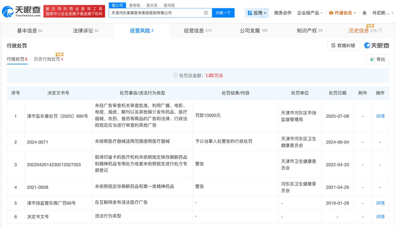 天眼查数据:外泌体涉事美莱医学美容医院曾多次被罚 外泌体涉事美莱医学美容医院多次被起诉 央视315晚会曝光“万能”的外泌体,天津河东美莱医学美容医院有限公司被点名。 天眼查App显示,天津河东美莱医学美容医院有限公司成立于2014年3月,法定代表人为邱长贵,注册资本3000万人民币,经营范围包括医疗美容服务、医疗服务、生活美容服务,由美莱医学美容集团有限公司、厦门华医馆投资有限公司共同持股。天眼风险信息显示,该公司存在多条行政处罚信息,其中,2025年7月,该公司因违规发布广告被罚,2024年6月,该公司因未按照医疗器械适用范围使用医疗器械被罚,2021年4月,该公司因未依照规定存麻醉药品和第一类精神药品被警告。此外,该公司多次因医疗纠纷被起诉。 天眼查信息: