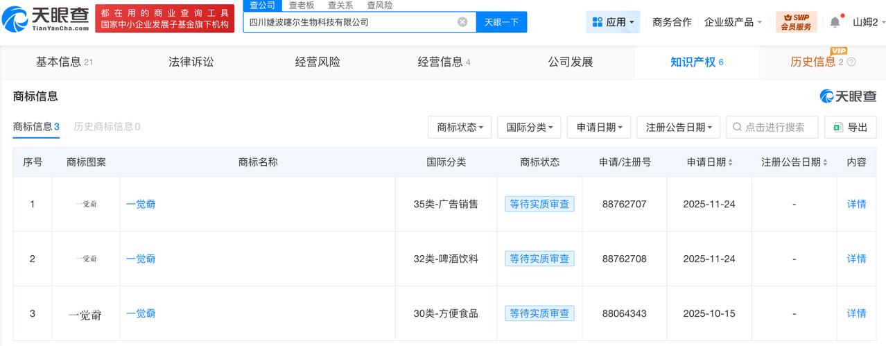 天眼查数据:315曝光婕波噻尔公司前年参保人数为0 婕波噻尔曾申请一觉奣商标 央视315晚会曝光“万能”的外泌体问题,四川婕波噻尔生物科技有限公司被点名。 天眼查App显示,四川婕波噻尔生物科技有限公司成立于2024年5月,法定代表人为谭阳,注册资本1000万人民币,经营范围包括细胞技术研发和应用、人体干细胞技术开发和应用、健康咨询服务等,由四川捷啵阳尔健康管理有限公司、谭阳共同持股。参保人数信息显示,该公司2024年参保人数为0。知识产权信息显示,该公司曾于去年申请注册多枚“一觉奣”商标,国际分类为广告销售、啤酒饮料、方便食品,当前商标状态为等待实质审查。 天眼查信息: