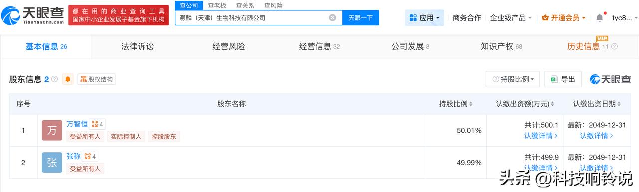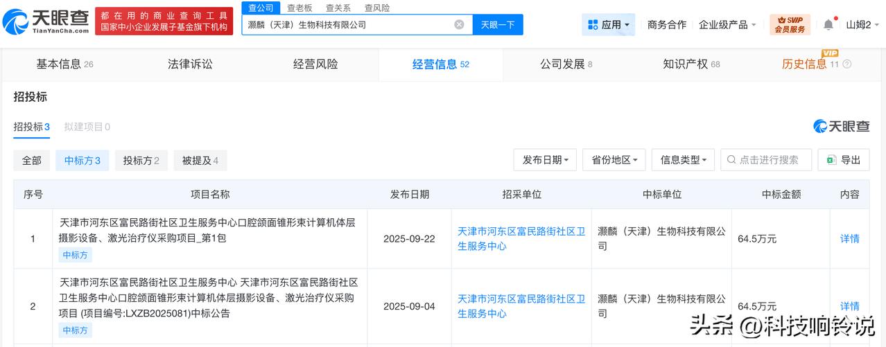 【天眼查数据:灏麟生物曾中标社区卫生服务中心采购项目】 央视315晚会曝光“万能”的外泌体问题,灏麟(天津)生物科技有限公司被点名。 天眼查App显示,灏麟(天津)生物科技有限公司成立于2019年6月,法定代表人为张称,注册资本1000万人民币,经营范围包括人体干细胞技术开发和应用、人体基因诊断与治疗技术开发、细胞技术研发和应用等,由万智恒、张称共同持股。招投标信息显示,该公司于去年9月中标“天津市河东区富民路街社区卫生服务中心”采购项目。 天眼查信息: