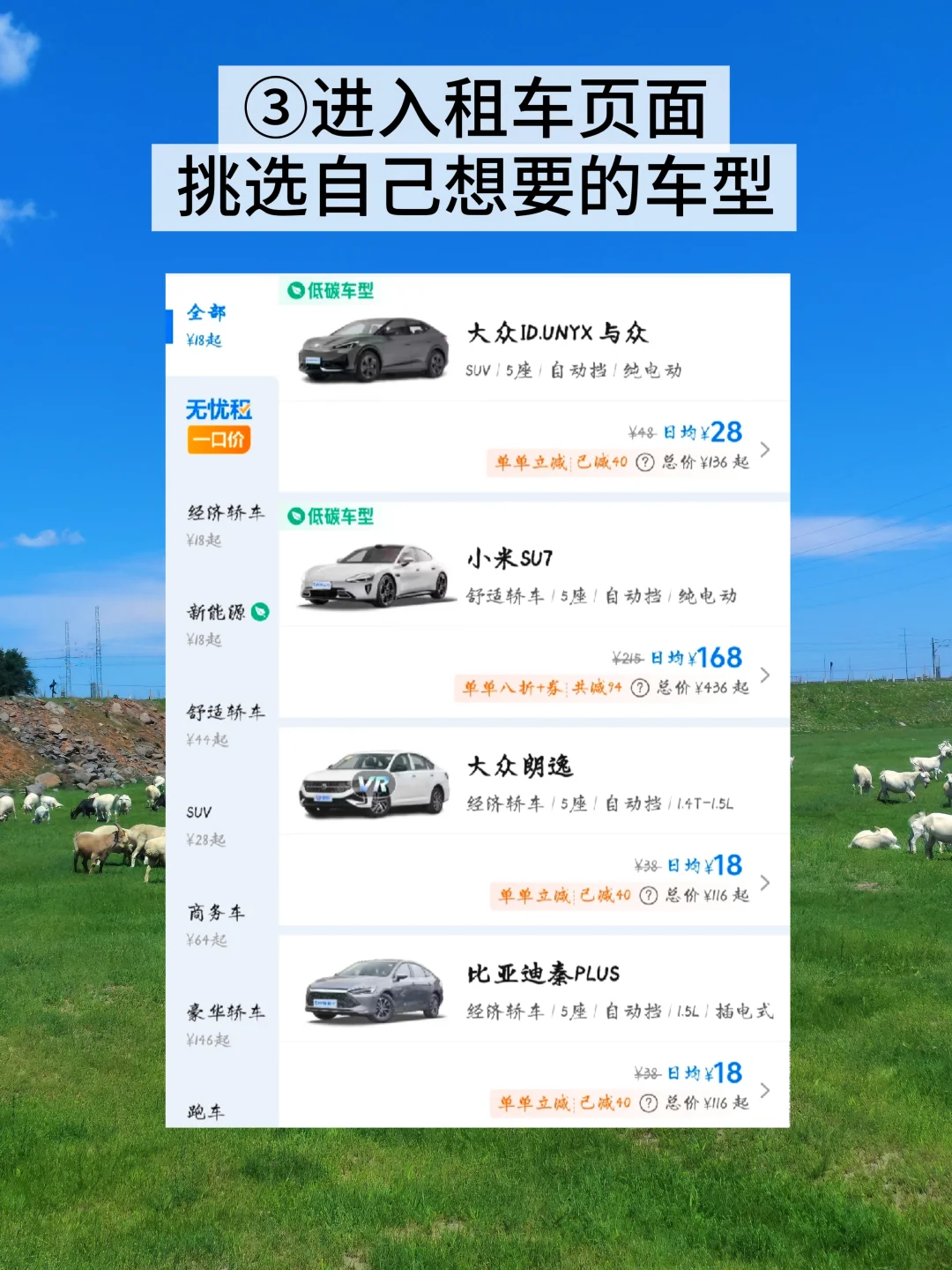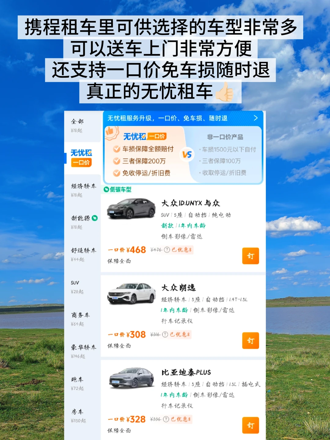 ④进入租车页面,挑选自己想要的车型。里面可供选择的车型非常多,可以送车上门很方便,还支持一口价免车损随时退等服务,真正的无忧租车🥳