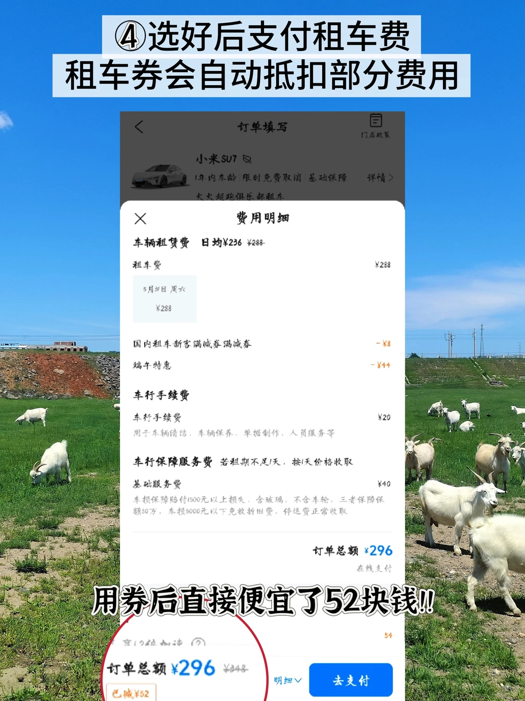 ⑤选好后支付租车费,租车券会自动抵扣部分费用