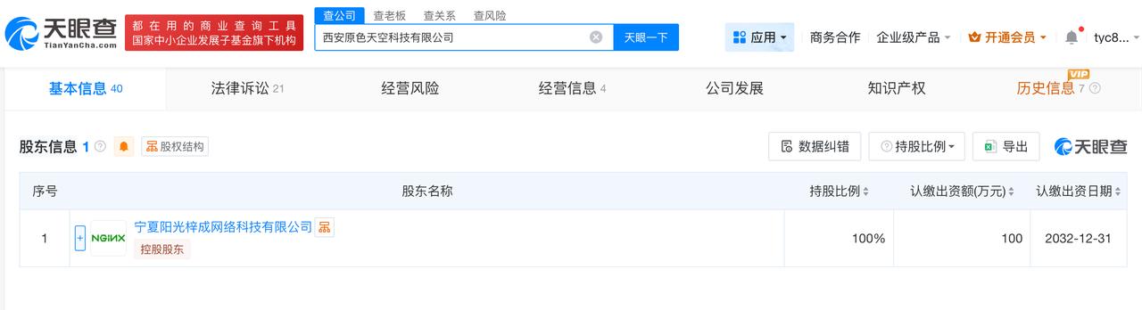 天眼查数据:天空出行前年参保人数为1人 起底天空出行关联公司 央视315晚会曝光狂飙的租赁电动自行车问题,天空出行关联公司被点名。 天眼查App显示,天空出行关联公司西安原色天空科技有限公司成立于2022年11月,法定代表人为尹汉光,注册资本100万人民币,经营范围包括租赁服务、信息技术咨询服务、电池销售等,由宁夏阳光梓成网络科技有限公司全资持股。参保人数信息显示,该公司2024年参保人数为1人。 天眼查信息: