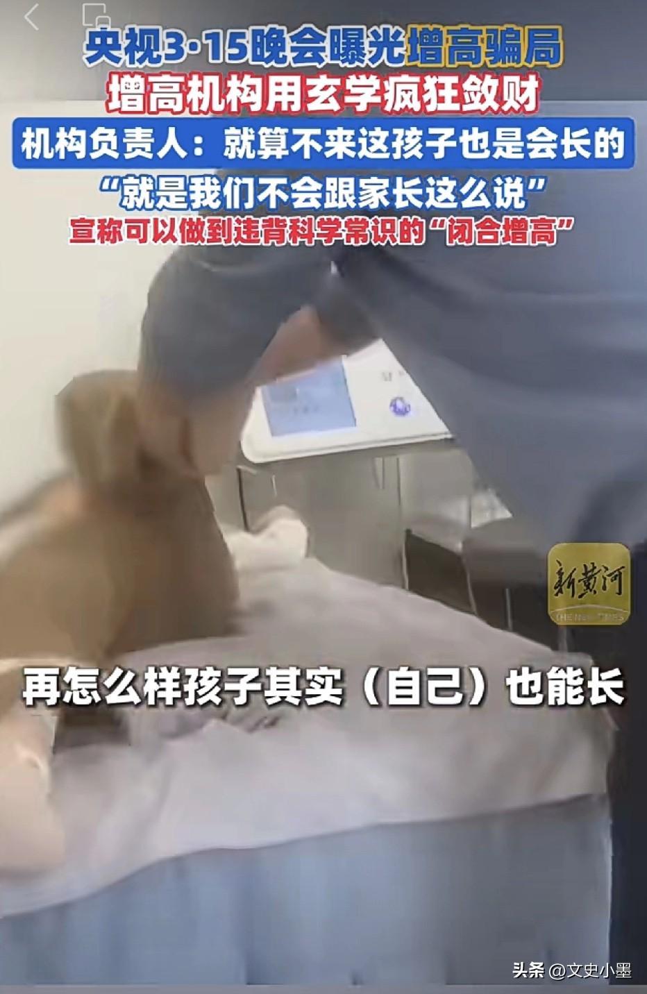 古有拔苗助长,今有直骨增高! 原来所谓的增加身高,其实是让骨骼变直了的虚假增高,并不是真的长高了! 315曝光的这些增高机构真敢忽悠,不但能让孩子长高,成年人也可以实现增高,有的甚至还可以玄学增高!这些增高的方式根本没有临床数据或者医学验证报告,完全是他们自己瞎编的! 其中一位负责人说出了句实话:“孩子本身就要长,是吧,就算不来我们这里,孩子也是会长的,就是我们不会跟家长这么说。” 像这样的机构有的规模已经遍布了十几个省,门店数量达数十家,并且还不断有人想要加盟分一杯羹! 这些机构之所以能够生存下去,主要源于一些人对身高的普遍焦虑、监管滞后、营销话术包装以及部分机构利用“无效退款”等承诺降低消费者心理门槛。