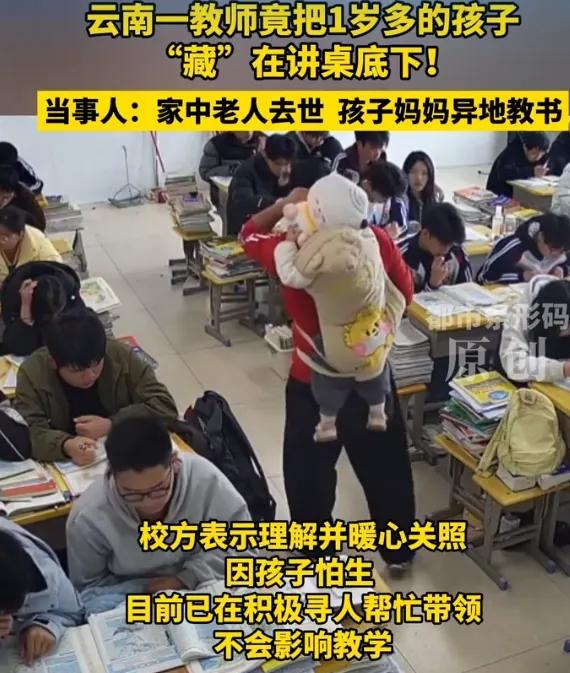 看哭了!云南昭通,一位老师因为家中老人去世,妻子又在异地教书,无奈之下,带着一岁的孩子到班级上课,而为了不打扰班里的学生,他把孩子“藏”在讲桌底下,用自己的行动,证明了什么叫做为人师表。 最近云南一间普通教室的视频刷爆全网,几万条转发、评论区直接炸了锅,无数网友看了瞬间泪目,大家都说看这段视频,不是看新闻,是看见了当年那个为了生活。 咬牙硬扛的自己,而视频里最让人揪心的,是讲台下那个刚学会走路的奶娃子,没人能想到訾老师站在讲台上讲课的时候,脚边还藏着一个小脑袋瓜 訾老师是云南昭通当地的乡村教师,已经在基层教学岗位上坚守了多年。 他所在的乡村学校师资力量紧张,每位教师都承担着固定的教学任务,很难临时调配。 班里的学生全是周边村镇的孩子,课程一旦中断,会直接影响整体学习安排。 家中老人突然离世,给了訾老师沉重的打击,生活的压力全部落到他的肩上。 他的妻子在另一处偏远乡村任教,两地距离较远,无法及时返回照料孩子。 一岁的幼儿无人看管,成了他当下最无法解决的现实难题。 他不是没有动过请假的念头,可一想到教室里等待上课的学生,他又放弃了这个想法。 乡村教师的岗位容不得半点空缺,他的缺席会让整个班级的教学陷入停滞。 他最终做出决定,把孩子带在身边,坚持完成每一堂课的教学。 为了不分散学生的注意力,不打乱课堂节奏,他选择将孩子安置在讲桌下方。 他提前在狭小的桌底铺好软垫,让孩子能安静地待在有限的空间里。 整堂课上,他始终保持站立讲课,尽量减少动作,避免惊扰到孩子。 课堂上的訾老师,状态和平时毫无差别,认真讲解知识点,和学生互动交流。 学生们专注投入到学习中,没有人察觉老师脚边藏着一个年幼的孩子。 只有下课铃声响起,他才会立刻蹲下身,抱起孩子轻声安抚。 视频在网络上传播后,没有任何刻意的煽情,却让无数网友看得红了眼眶。 大家从这段画面里,看到了基层工作者的身不由己,也看到了为人父母的无奈。 更多人被訾老师在困境中仍坚守岗位的举动,深深打动。 云南昭通部分山区教学条件有限,乡村教师的工作强度远高于城市教师。 他们不仅要完成教学任务,还要兼顾学生的日常管理,一人身兼数职是常态。 多数乡村教师薪资不高,却始终把学生的成长放在工作的核心位置。 訾老师的行为,不是一时的选择,而是基层教师面对生活与工作冲突的真实写照。 他没有向学校提出特殊照顾,也没有向外界倾诉自己的难处,只是默默承担一切。 为人师表的意义,从来都不是挂在嘴边的话语,而是落在实处的责任。 大众对教师的印象,常常停留在稳定的作息和充足的假期上。 很少有人关注到乡村教师面临的家庭压力、生活困境和工作重担。 他们和普通人一样,有亲人需要照料,有生活琐事需要处理。 他们在家庭遭遇变故时,没有放下学生,而是用最笨拙的方式扛起双重责任。 讲桌下是割舍不下的亲情,讲台上是不能辜负的职责,两者他都不愿放弃。 这份平凡的坚守,远比刻意的宣传,更能体现教师的职业初心。 学校在了解到訾老师的实际情况后,第一时间为他提供了力所能及的帮助。 身边的同事也主动伸出援手,在课余时间帮忙照看孩子,减轻他的负担。 乡村校园里的温情,就在这样的互相扶持中,不断传递开来。 这个视频能引发全网共鸣,核心原因是它足够真实,没有半点虚假包装。 它展现的不是惊天动地的事迹,只是一个普通人在生活里的咬牙坚持。 它让更多人看见,基层教师的伟大,藏在不为人知的日常里。 我们常常赞美教师的无私奉献,却容易忘记他们也是需要被理解的普通人。 他们有疲惫的时候,有无助的时刻,却始终把学生的教育放在第一位。 訾老师用实际行动证明,师德的核心,是责任与坚守。 乡村教育的稳步发展,离不开无数像訾老师这样扎根基层的教师。 他们守着小小的教室,陪着一批又一批乡村孩子,走过求学的道路。 他们的默默付出,值得被全社会看见、尊重与铭记。 生活从来都不会一帆风顺,每个人都在自己的岗位上默默扛着重担。 訾老师的故事,让我们看见平凡人的坚守,也看见教育最纯粹的模样。 讲台之上是使命,讲台之下是生活,二者兼顾,便是最动人的为人师表。 各位读者你们怎么看?欢迎在评论区讨论。
