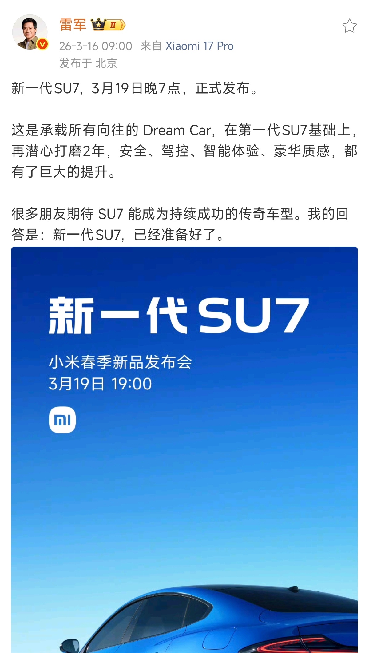 大家猜对了吗,新一代 SU7 将于 3 月 19 日正式上市。新一代SU7小米新