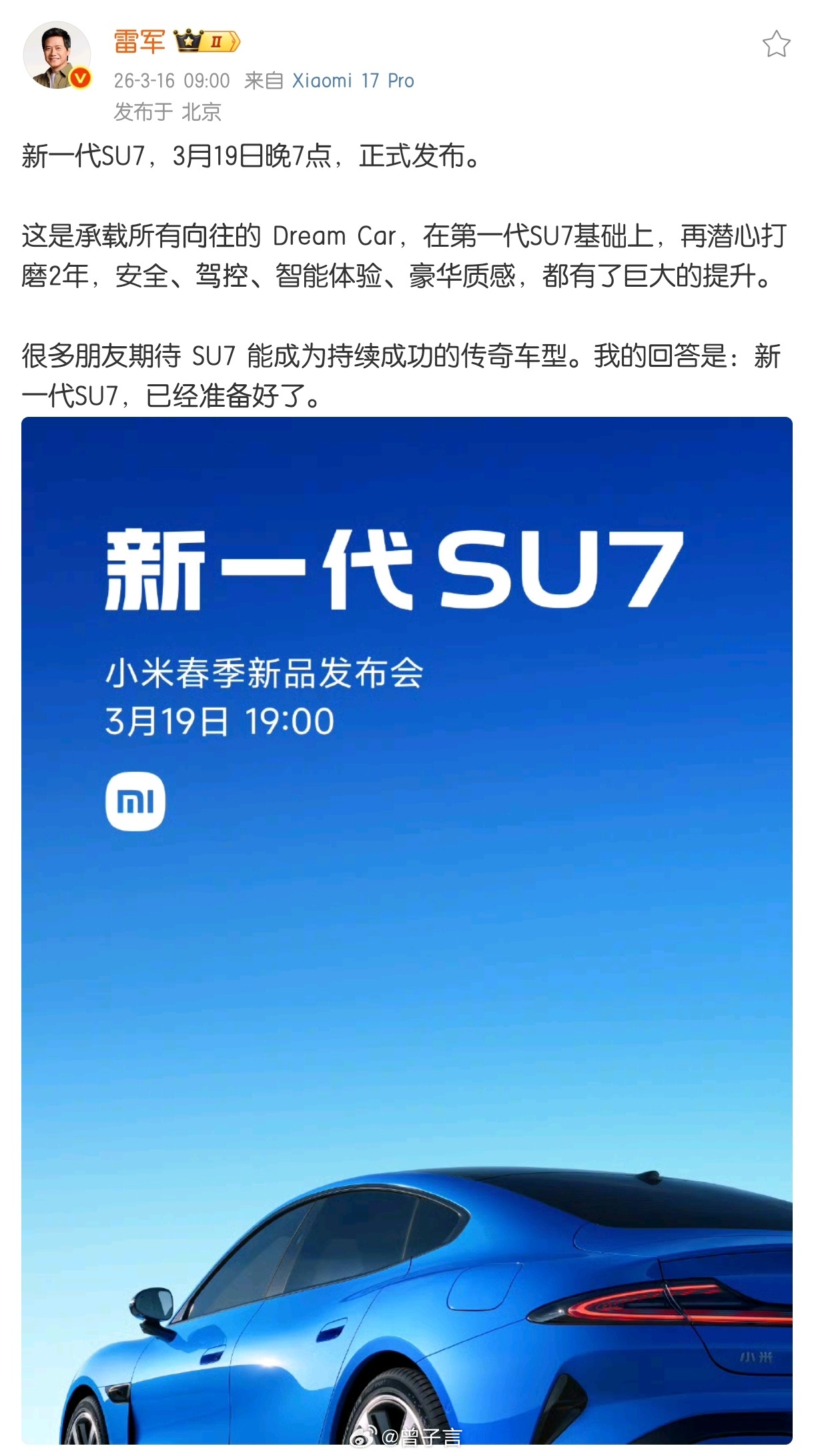 新一代小米SU7 定档 3 月 19 日晚七点。