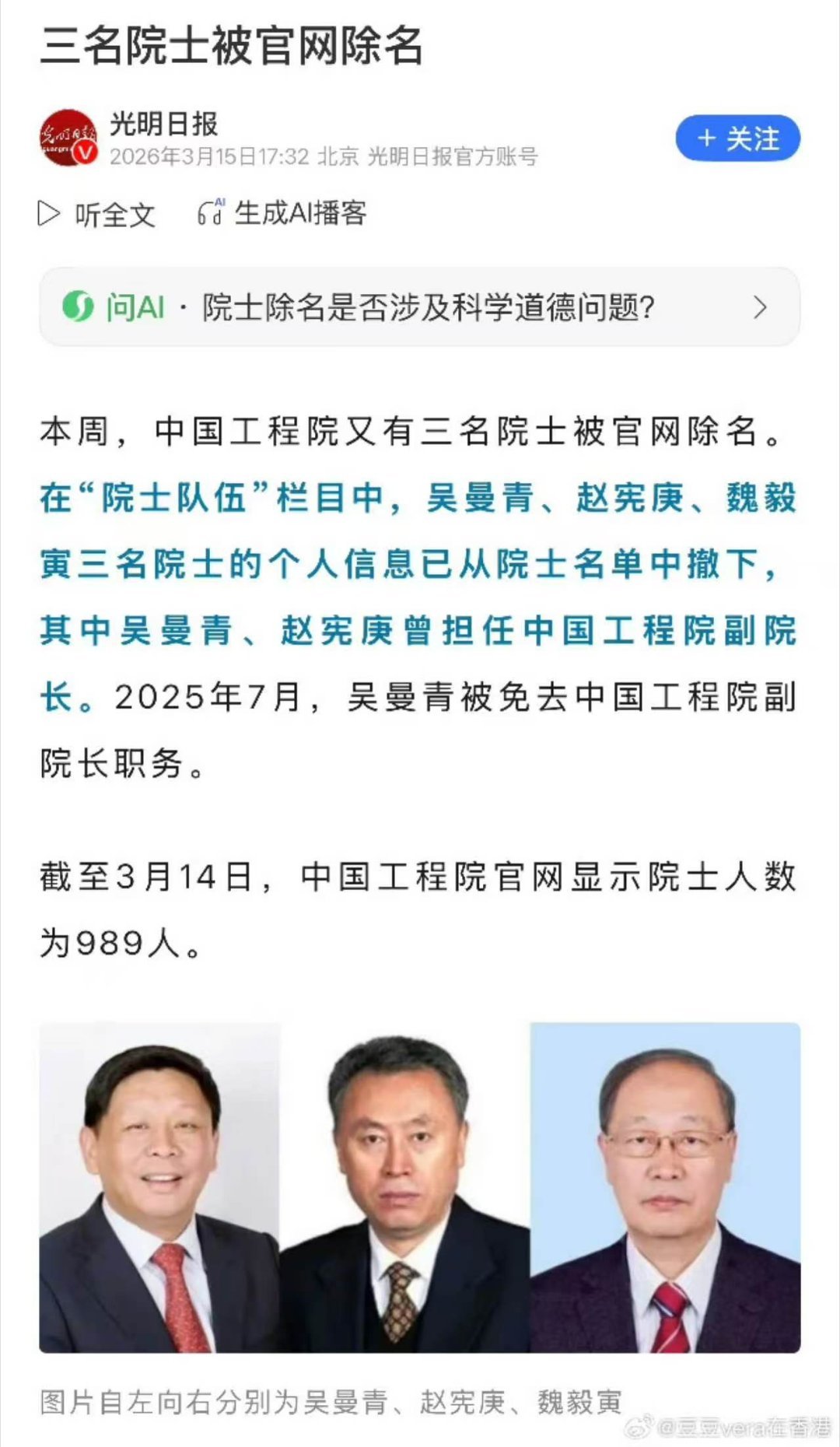 3月15号,就昨天的事儿,中国工程院官网悄没声地更新了一下,这一更新不要紧,三个