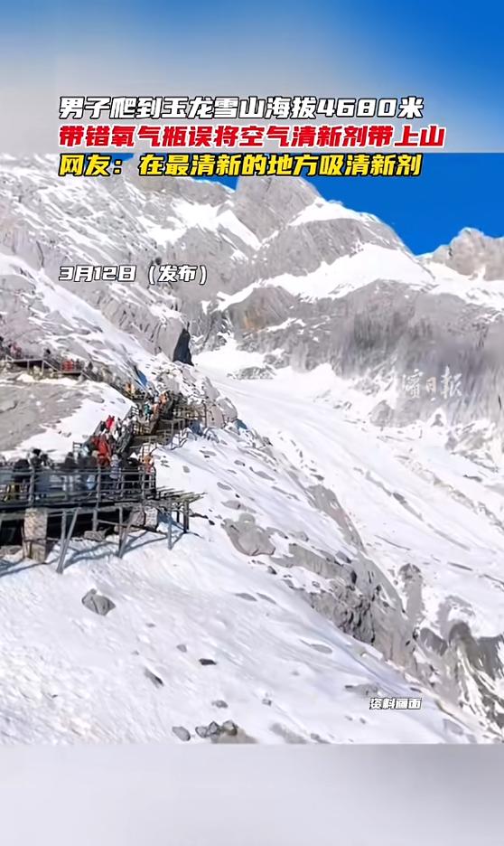 “笑不活了!”近日,云南丽江,一男子准备去爬玉龙雪山,因为海拔比较高,所以男子提前准备了氧气瓶,没想到爬到观景台后,他正想掏出氧气瓶缓解高反,结果发现自己带错了,拿的竟然是空气清新剂!网友:在最清新的地方吸清新剂! 事情发生在今年3月12日,云南丽江的玉龙雪山,海拔4680米的观景台上,寒风呼啸空气稀薄,一位男子气喘吁吁地爬上观景台,高反带来的心慌气短让他浑身难受,他赶紧停下脚步,颤抖着从背包里掏出自己提前准备好的“救命稻草”——他以为的氧气瓶,准备喷一口缓解不适。 可当他按下喷头的瞬间,扑面而来的不是期待中的氧气,而是一股浓郁的茉莉花香,瞬间驱散了周围的寒气,也让他整个人彻底愣住了,他下意识地低头,死死盯着手里的瓶子,瓶身上五个大字清清楚楚,不是氧气瓶而是空气清新剂,那一刻他估计都懵了,站在寒风里举着空气清新剂,一脸茫然,场面又荒诞又好笑。 谁能想到这位游客特意为爬玉龙雪山做了准备,知道海拔高、氧气少,提前备好“氧气瓶”防身,就是怕出现高反,可偏偏在最需要氧气的时候,才发现自己拿错了东西,当时周围的游客,几乎都在拿着氧气瓶疯狂吸氧,每个人都面色凝重,唯独他举着一瓶空气清新剂,在风中凌乱,那种格格不入的样子,想想都觉得好笑。 说真的这场面实在太荒诞了,大家都知道,玉龙雪山是全中国空气质量最好的地方之一,那里的空气纯净又清新,不含一点杂质,可这位男子却大老远跑到这里,手里攥着一瓶人工香氛,想要靠它缓解高反,简直是闹了个天大的笑话。 男子反应过来后,也不知道自己该哭还是该笑,无奈之下索性掏出手机,把自己这个离谱的大乌龙拍了下来发到了网上,没想到视频一经发布,评论区直接炸了,网友们的调侃扑面而来,有人说“好家伙,这是嫌雪山的空气不够香,特意来给自然喷香水的吧”,还有人调侃“别人吸氧续命,你吸花香提神,格局瞬间打开了”。 调侃归调侃笑过之后,其实这事挺危险的。大家可别觉得这只是个好笑的乌龙,海拔4680米的高度可不是开玩笑的,那里的空气含氧量,只有平原地区的六成,就算是身体再好的人,爬到这个高度,也难免会出现高反,心慌、气短、头晕都是常有的事,基本都得靠氧气瓶续命。 这位男子还算幸运,景区的补给站还有氧气卖,他赶紧花钱买了氧气瓶,才缓解了高反,没有出现更严重的情况,要是当时补给站没有氧气,他恐怕当场就得栽在那里,后果不堪设想,虽说最后花钱补救了,但这“智商税”交得,估计他自己都觉得心疼。 更有意思的是这并不是个例,视频火了之后,评论区里一堆人开始分享自己的“粗心史”,有人说自己去海边度假,带了三副墨镜,却忘了带泳裤,全程只能在岸边看着别人玩水,有人说出门旅游,把防晒霜当护手霜抹了一路,手上又油又白,还有人带了充电宝,却忘了带充电线,手机没电只能全程失联,一个个粗心的瞬间,跟这位男子的乌龙如出一辙。 其实每个人都能在这场闹剧中,找到自己的影子,谁还没有过粗心大意的时候呢,但笑过之后,我们也得明白,高原地带不比平地,去这种高海拔地区,装备检查不是仪式感,而是生存必修课。 氧气、急救药这些保命的东西,出门前真得瞪大眼睛核对清楚,不能有一点马虎,一个低级的粗心错误,碰上高风险的环境,代价可能就不只是尴尬那么简单,甚至会危及生命。 所以要是你也打算去挑战玉龙雪山,去冲顶高海拔观景台,临出门前一定要多检查两眼背包,核对好每一样必备物品,别像这位男子一样,闹出让人笑不活了的乌龙,更别让自己成为下一个,在海拔4000多米的雪山上,对着空气清新剂发呆的人。 (信息来源:《男子爬到玉龙雪山海拔4680米,带错氧气瓶误将空气清新剂带上山。网友:在最清新的地方吸清新剂。》哈尔滨日报)