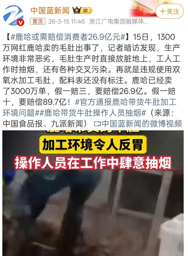 鹿哈估计要坐牢,这比小杨哥严重多了 2026年3月16日,315消费者权益日的热度还没完全褪去,一则千层毛肚的卫生丑闻就火速引爆全网,把近千万粉丝的网红鹿哈推上了舆论风口。 可能有人不知道,鹿哈本名凌达乐,早年靠模仿明星组建ESO“盗版男团”出圈,后来转型直播带货,还自己创办了MCN机构,甚至自曝带货7个月就赚了3500万。 此次被曝光的千层毛肚,正是他直播间的爆款产品,而曝光画面里的生产车间,简直脏到让人反胃——工作人员边干活边抽烟,烟灰直接落在食材旁,毛肚更是随意扔在破损的地面上冷却。 更离谱的是,这款毛肚疑似被鹿哈“垄断”销售,市面上几乎看不到其他大主播带货,目前累计销量已经冲到了3000万单,每一笔订单,都是消费者对他“现做现卖、假一赔十”承诺的信任。 据悉,涉事生产企业是四川川牛福食品有限公司,3月14日相关视频曝光后,当地市监部门当天就介入调查,责令企业停业整顿,抽样送检相关原料和成品。 如今随着调查深入,鹿哈面临的麻烦越来越大,单是赔偿金额就足以压垮他——按法律规定的“假一赔三”算,赔偿高达26亿元;要是严格兑现他直播时的“假一赔十”,总额会飙升到80多亿元。 这笔天文数字般的赔款,别说鹿哈个人,就算是头部MCN机构也扛不住,一旦落实,资金链必断,甚至可能直接破产清算。 很多人会拿他和之前小杨哥的虚假宣传争议对比,但两者性质完全不同:小杨哥的问题是夸大宣传,顶多是违规;而鹿哈涉及的是食品安全,直接关系到千万家庭的身体健康。 要知道,315这个节点本就是监管的重点时期,此次丑闻在这个时候曝光,意味着监管部门早已启动调查,绝非简单的舆论谴责。 如果最终查实生产环节存在严重违法,比如曝光中提及的涉嫌违规使用双氧水,鹿哈本人不光要赔钱,还可能面临牢狱之灾,这可不是简单的罚款或退货款就能解决的。 值得一提的是,3月20日就有两部食品安全新规要正式施行,明确要求直播平台必须管好直播间的人和货,杜绝无资质直播、虚假宣传等乱象。 鹿哈这事,刚好撞在了新规施行的节骨眼上,不仅是他个人的危机,更是给整个直播带货行业敲了一记响钟——流量从来不是遮羞布,选品把关不是口号,而是法定责任。 3000万单销量,背后是3000万个家庭的餐桌期待,如今这份期待被满地乱扔的毛肚和吞云吐雾的工人彻底击碎,消费者对直播带货的信任,再一次受到重创。 鹿哈从电子厂打工少年逆袭成带货顶流,本该珍惜来之不易的口碑,却偏偏在食品安全上铤而走险,最终能不能全身而退,全看监管部门的调查结果。 说到底,舌尖上的安全是全社会的底线,不管是主播、MCN还是生产企业,谁敢突破红线,谁就必须付出代价。我们静待调查结果,也期待法律能还消费者一个公道,倒逼行业告别野蛮生长。