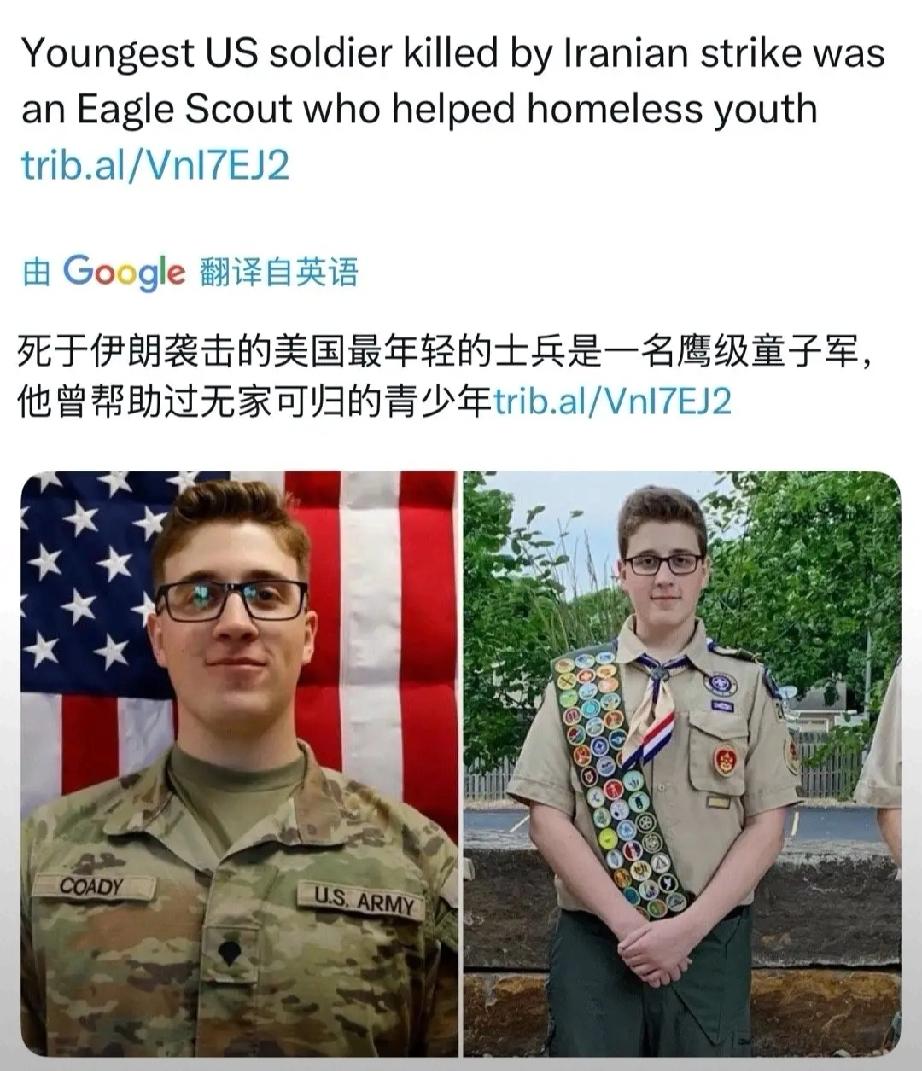 20岁,本是青春正好、充满无限可能的年纪,却为特朗普拿起枪,最终死在了伊朗战争里,实在太可惜。特朗普曾宣称“为了开心”可能再炸几次伊朗哈尔克岛,如此随意对待战争,把军事行动当儿戏。 美暗杀苏莱曼尼更是恐怖行径,公然违反国际法原则。在这些充满硝烟的冲突背后,是无数像这位20岁小年轻一样鲜活生命的消逝。战争没有赢家,那些被政治裹挟的年轻人成了牺牲品,他们的梦想、未来都在战火中灰飞烟灭。希望世界能多些和平,少些无谓的牺牲。