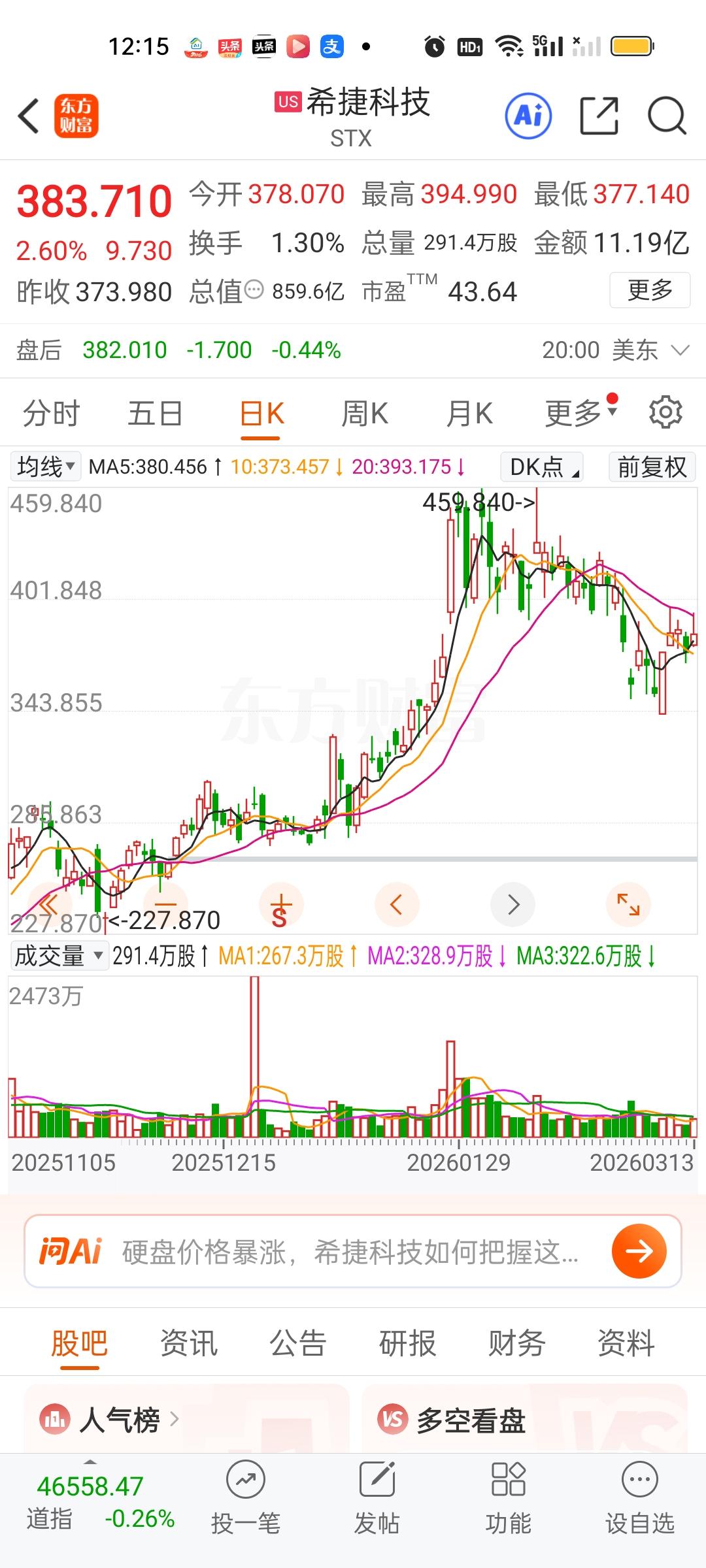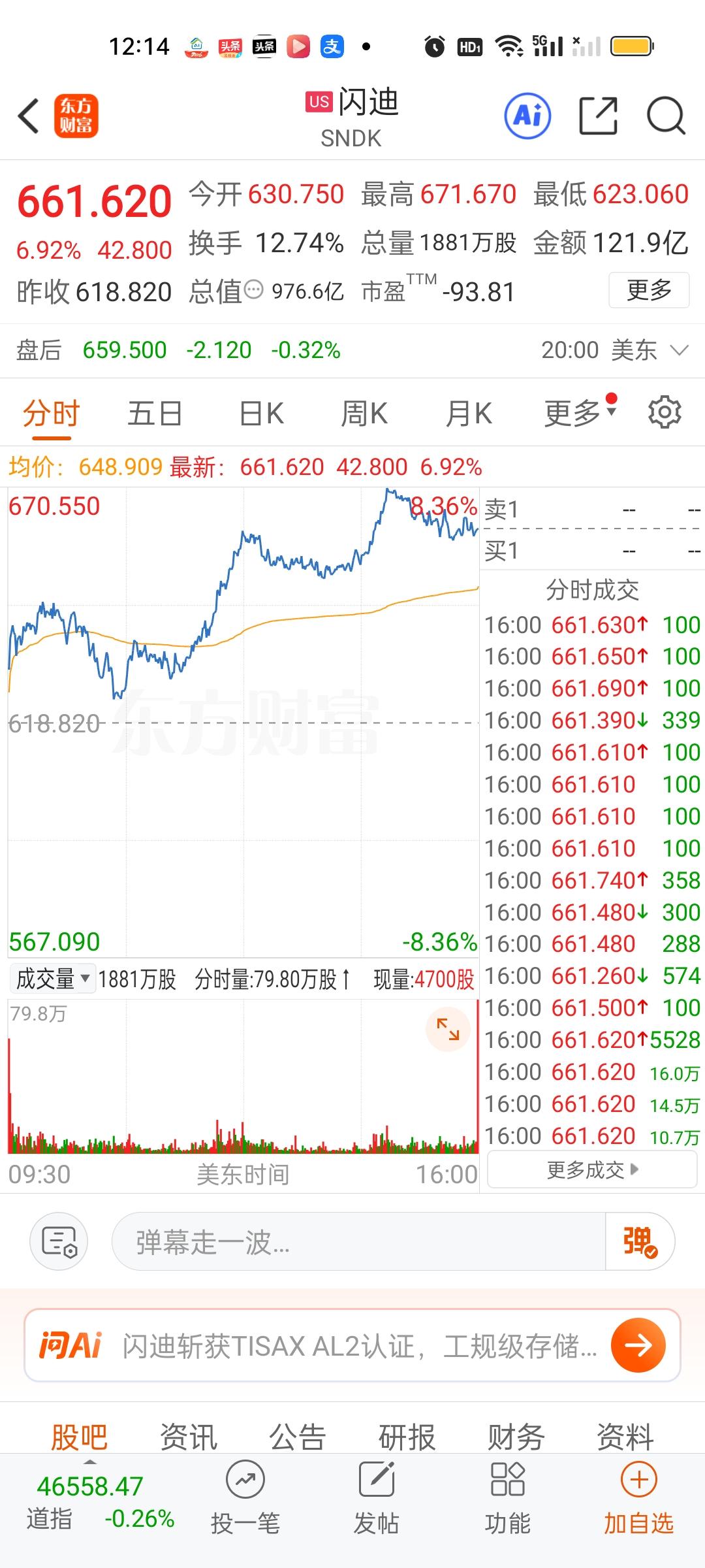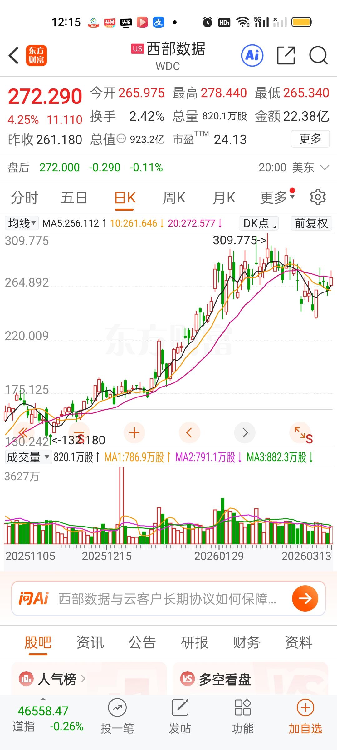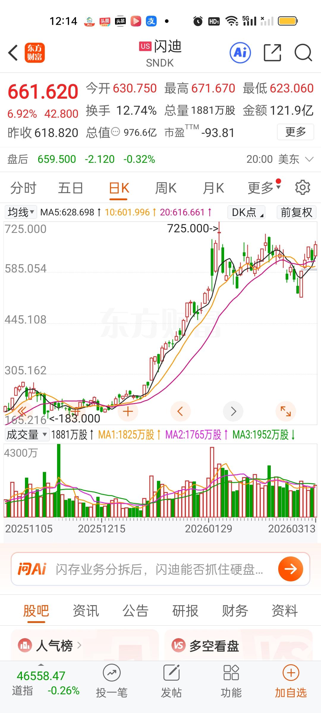 截止收盘存储芯片板块涨幅第一。创新药,恒生科技,白酒,食品饮料,医药,汽车整车,银行,房地产,农林牧渔等紧随其后。 跌幅方面,黄金,钢铁,有色金属,稀土永磁,化工,可控核聚变,电网设备,电力,基建,锂矿,煤炭,光伏,机器人,商业航天等跌幅都不小。 前面我们说过美股存储芯片板块迎来了连续数个交易日的上涨,看日线走势也是上涨趋势。今天来看我们还是跟了。