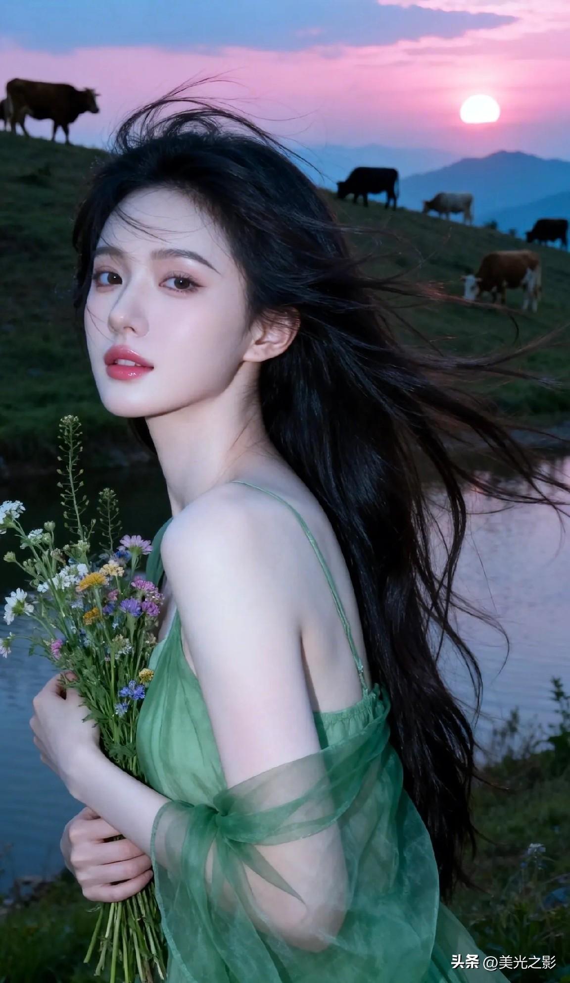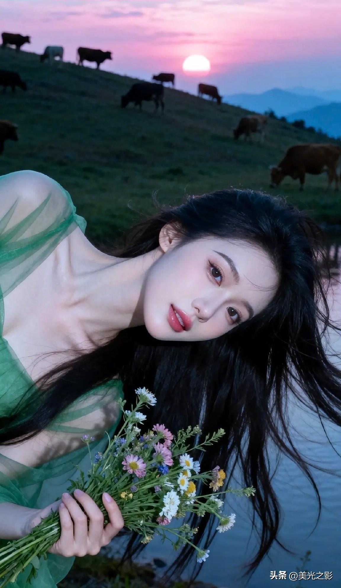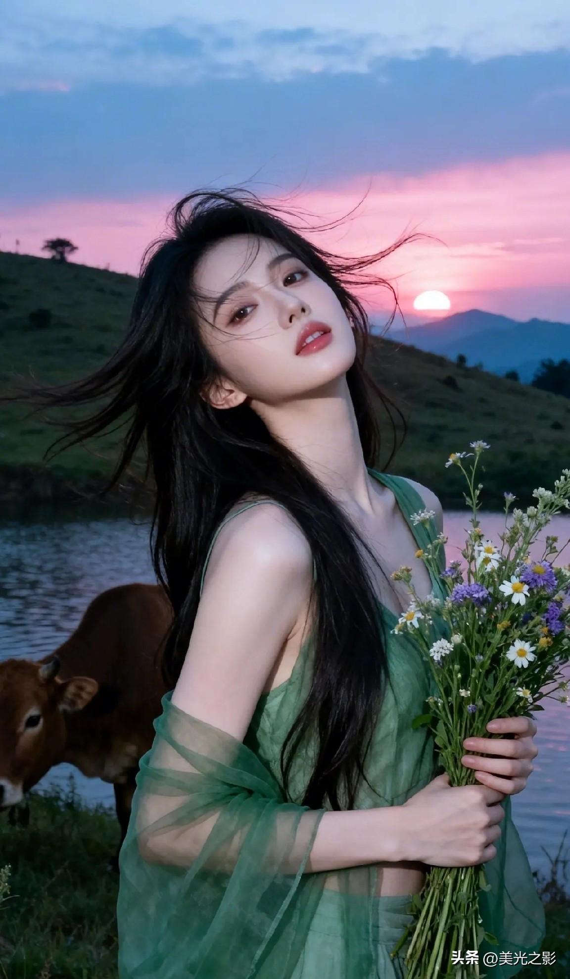 光之影&AI 绿衣美人倚芳草,日暮牛羊归。 绿裙溪景照 绿裙美人自拍 湖畔绿裙照