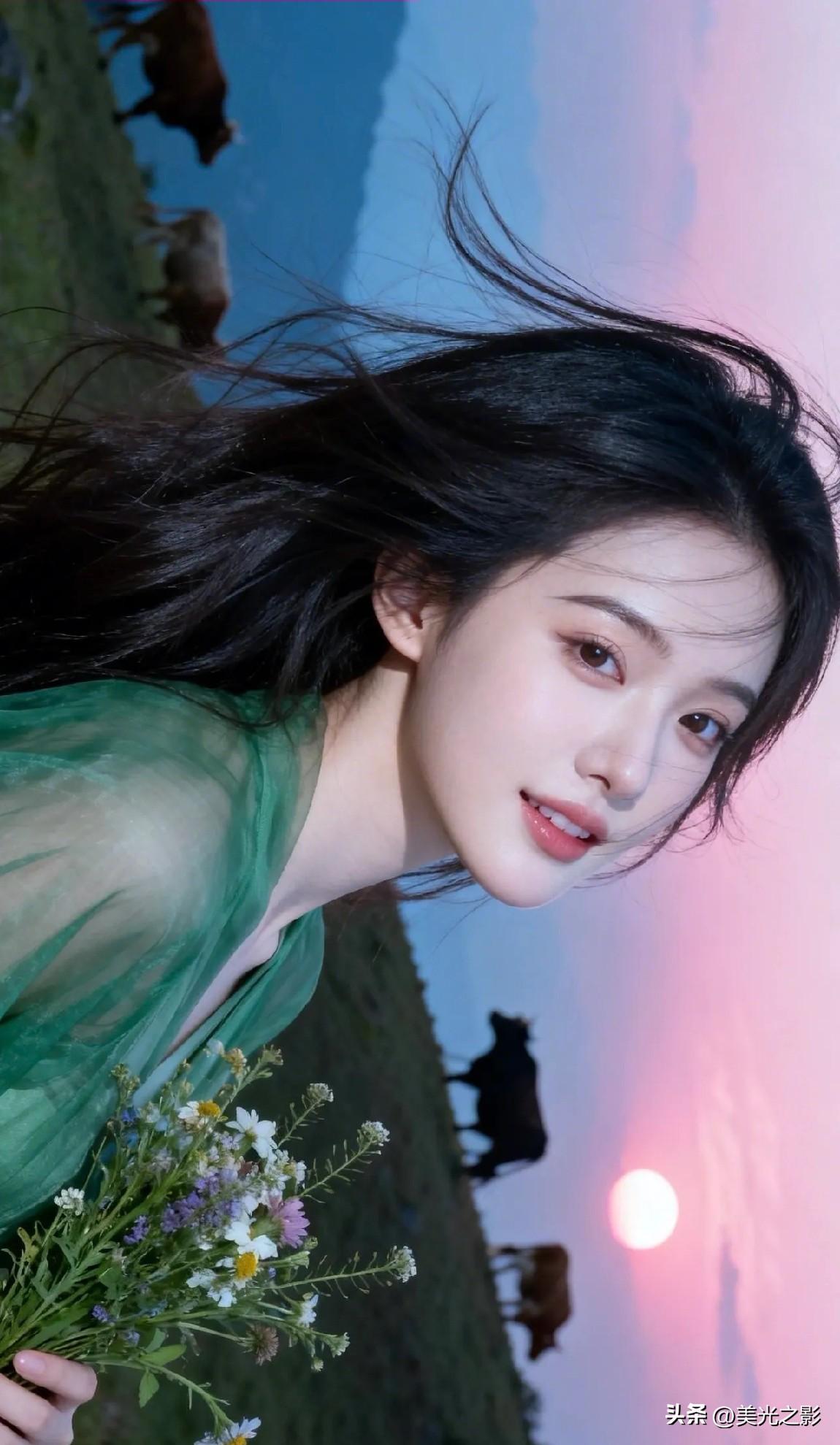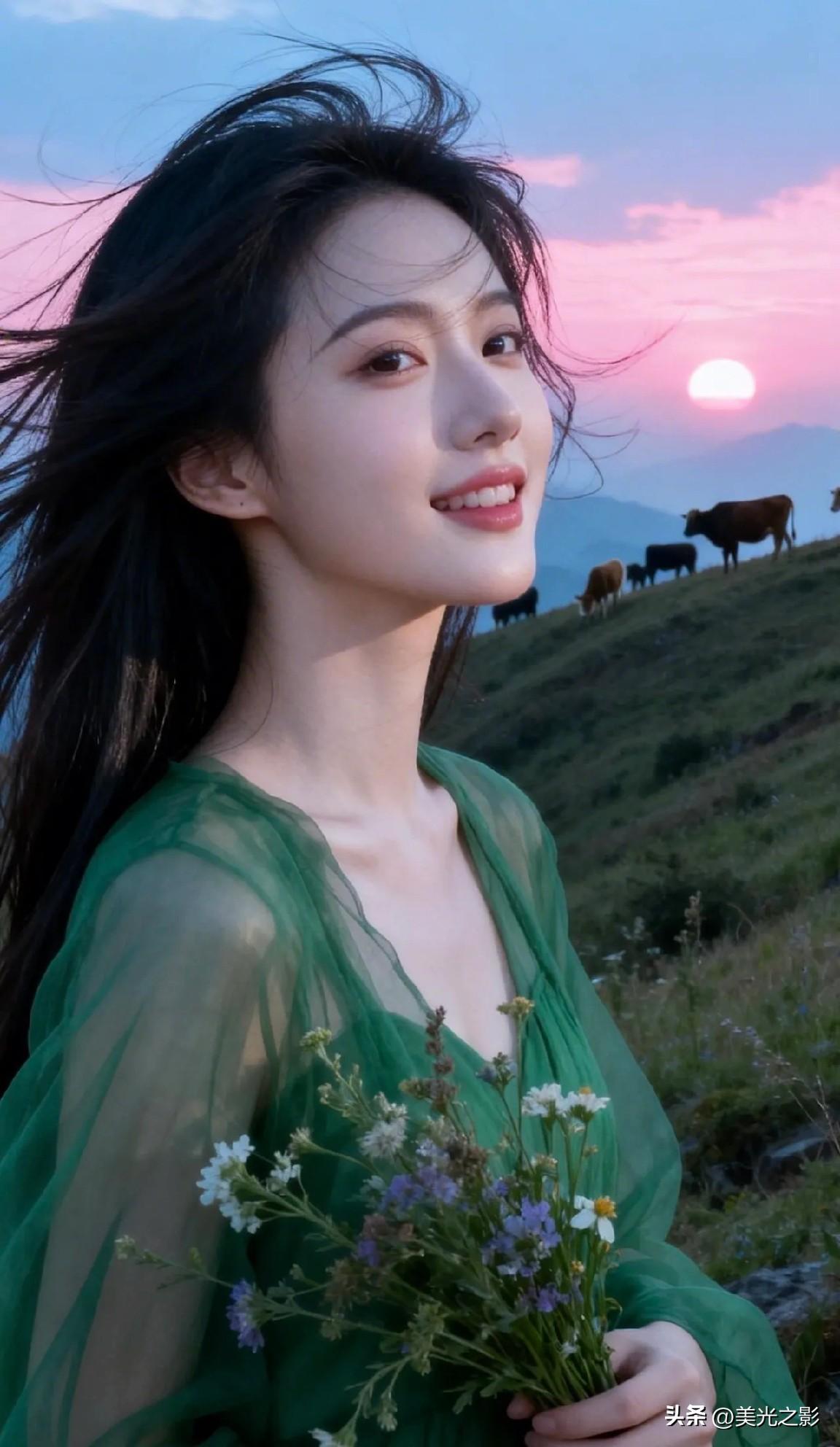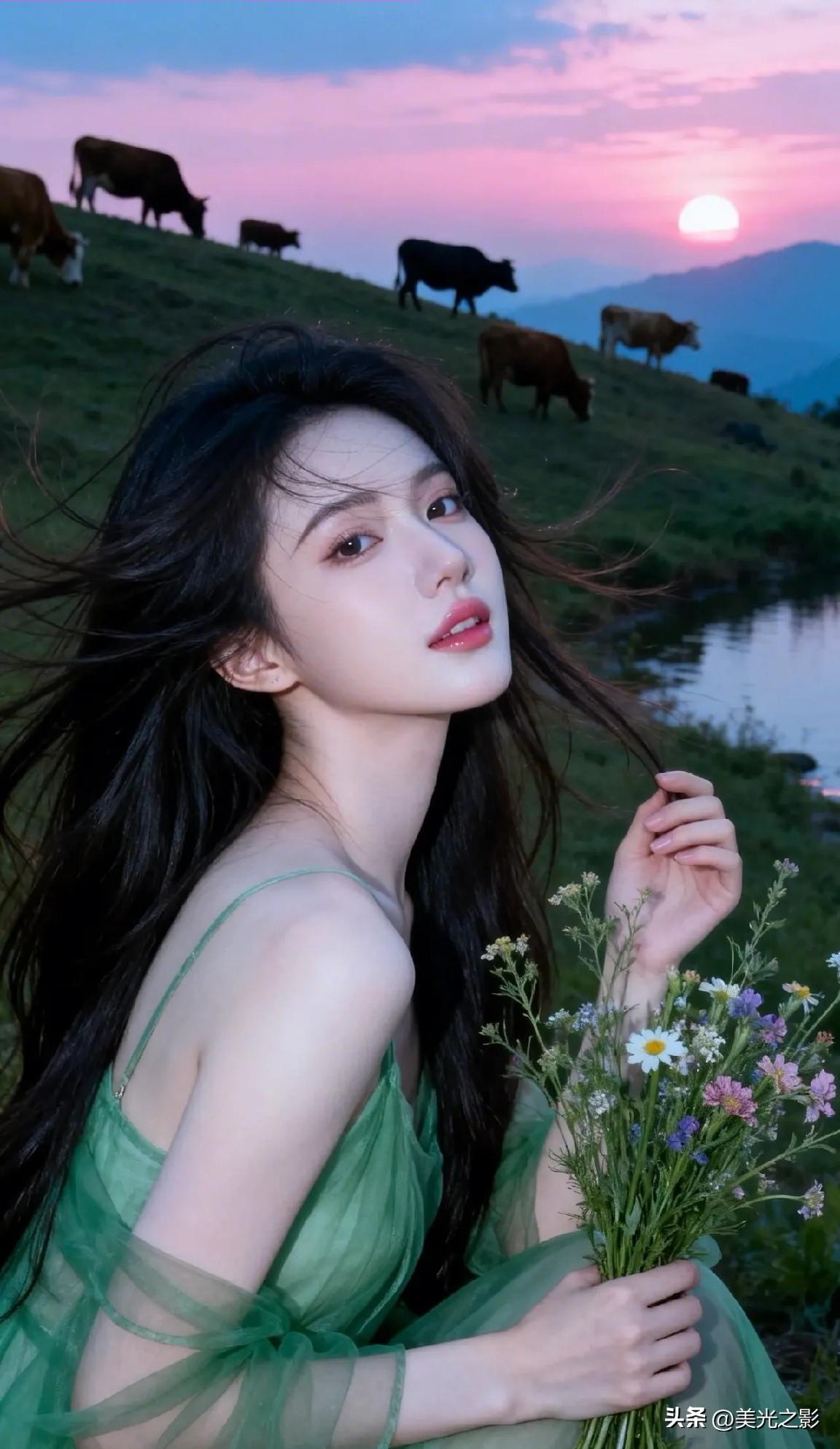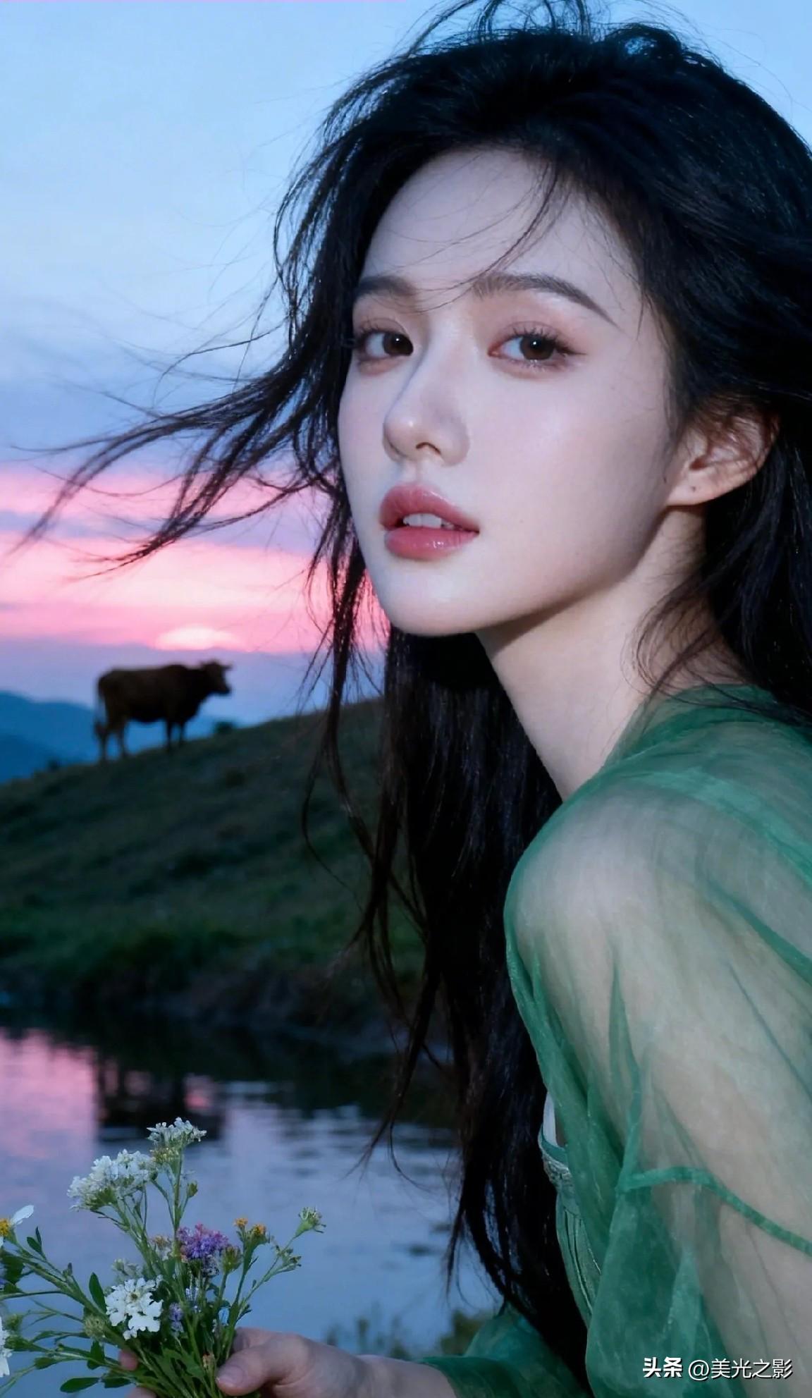 光之影&AI 绿衣美人倚芳草,日暮牛羊归。 绿裙溪景照 绿裙美人自拍 湖畔绿裙照