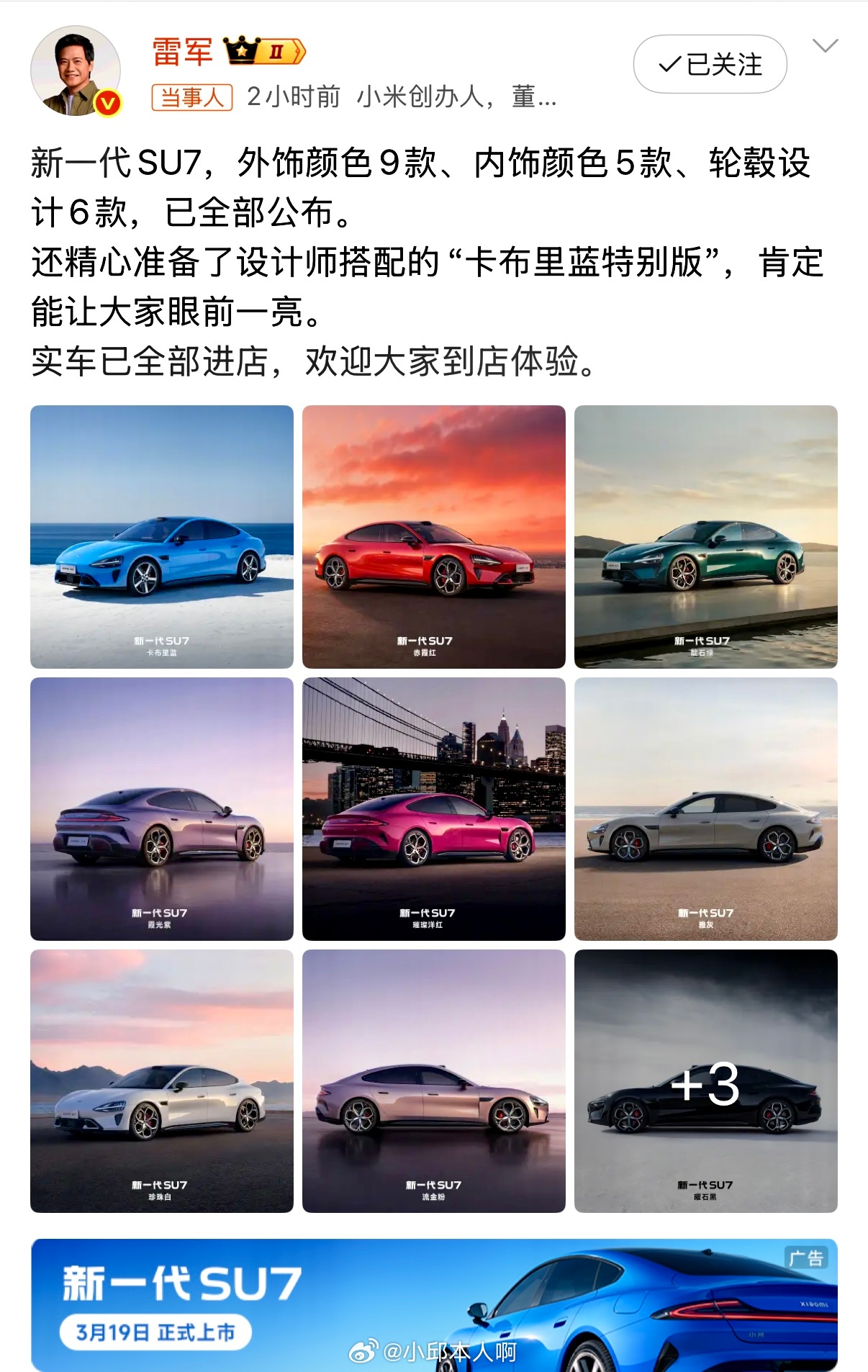 雷军刚刚官宣,小米SU7新增一款设计师推荐的“卡布里蓝特别版”。除了常规的多种颜色轮毂可选,这次直接给个成品,省去搭配烦恼。