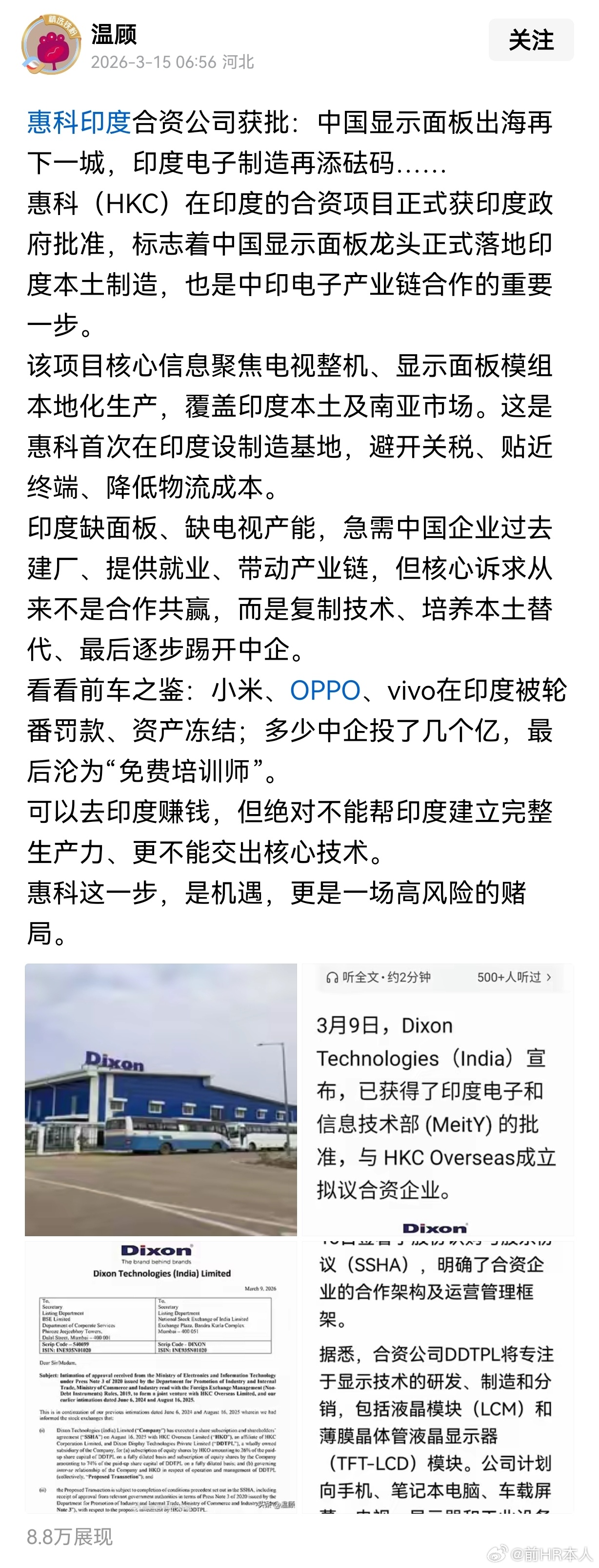 媒体报道说,惠科印度合资公司获批:中国显示面板出海再下一城,印度电子制造再添砝码……惠科(HKC)在印度的合资项目正式获印度政府批准,标志着中国显示面板龙头正式落地印度本土制造,也是中印电子产业链合作的重要一步。
