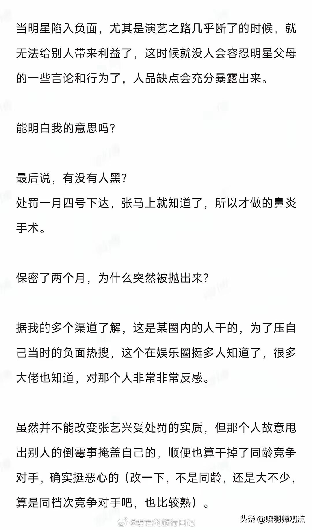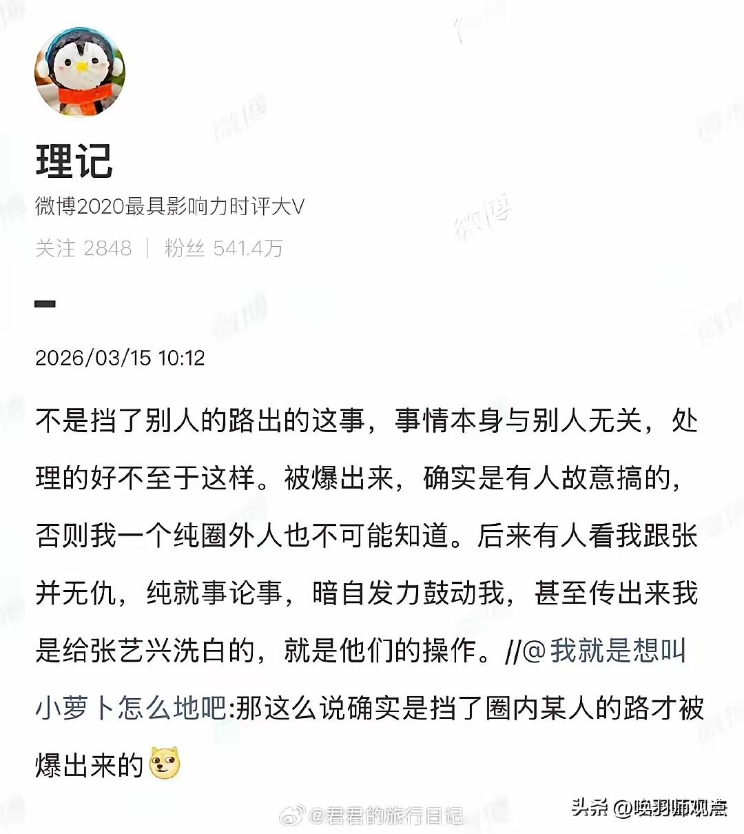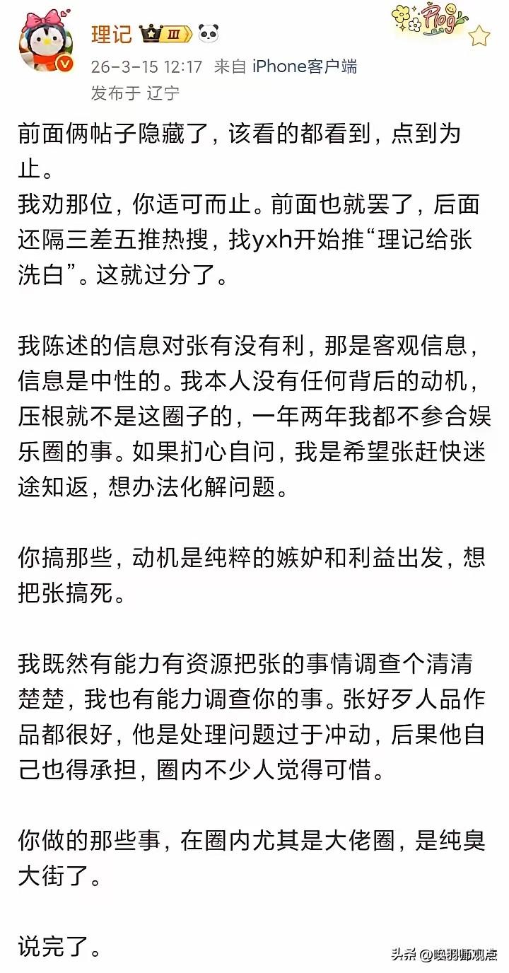 📰 张艺兴被黑真相反转!理记自曝被人当枪使,网友扒出幕后是张杰谢娜 3月15日,娱记理记发文承认,此前曝光张艺兴负面是被人“当枪使了”——利用他的是娱乐圈近期负面缠身的一对夫妻,女方曝张艺兴是为给老公挡枪。理记称“张艺兴的事确实是真的,圈内人都讨厌这对夫妻”。网友纷纷猜测是张杰谢娜,因谢娜与张艺兴同节目交集多,且张杰近期深陷“跳级读博士”学历质疑。 专家解读:这是娱乐圈经典公关手法“转移视线法”——制造更大话题分散公众注意力。圈内人讨厌这对夫妻,或因长期“捆绑营销”导致人设透支。 最新进展:理记闭麦,张杰谢娜沉默,张艺兴粉丝维权。 唤羽师观点:当“攻击别人”成为“保护自己”的手段,受伤的永远是没话语权的人。别急着站队,保持审慎。张艺兴演技封神 张艺兴采风 张艺兴金鸡奖 张艺兴明星资讯 张艺兴红毯造型 张艺兴旅游 张艺兴上海巡演 张艺兴大闹天空 张艺兴舞蹈争议 东北张艺兴 张艺兴演技大赏 张艺兴大舞台 张艺兴模仿 张艺兴翻拍 张艺兴带娃日常