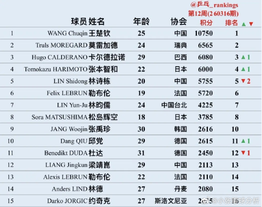 3月16日,随着重庆冠军赛的结束,WTT球员积分榜也随之发生变化。最新的积分榜上,20岁的林诗栋再降2名,来到世界第5位。1年前,他曾高居世界第1。