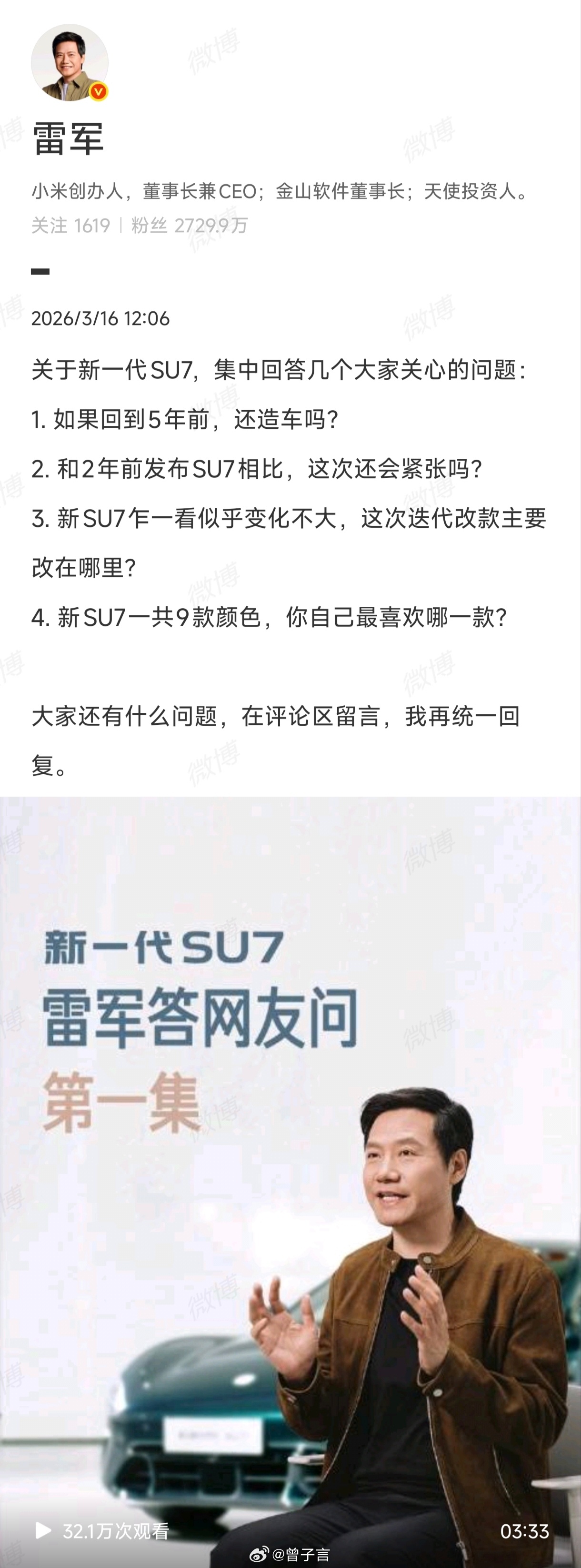 雷军表示新SU7内饰变化巨大 雷总刚发的新一代SU7 问答,直接给大伙交了底!