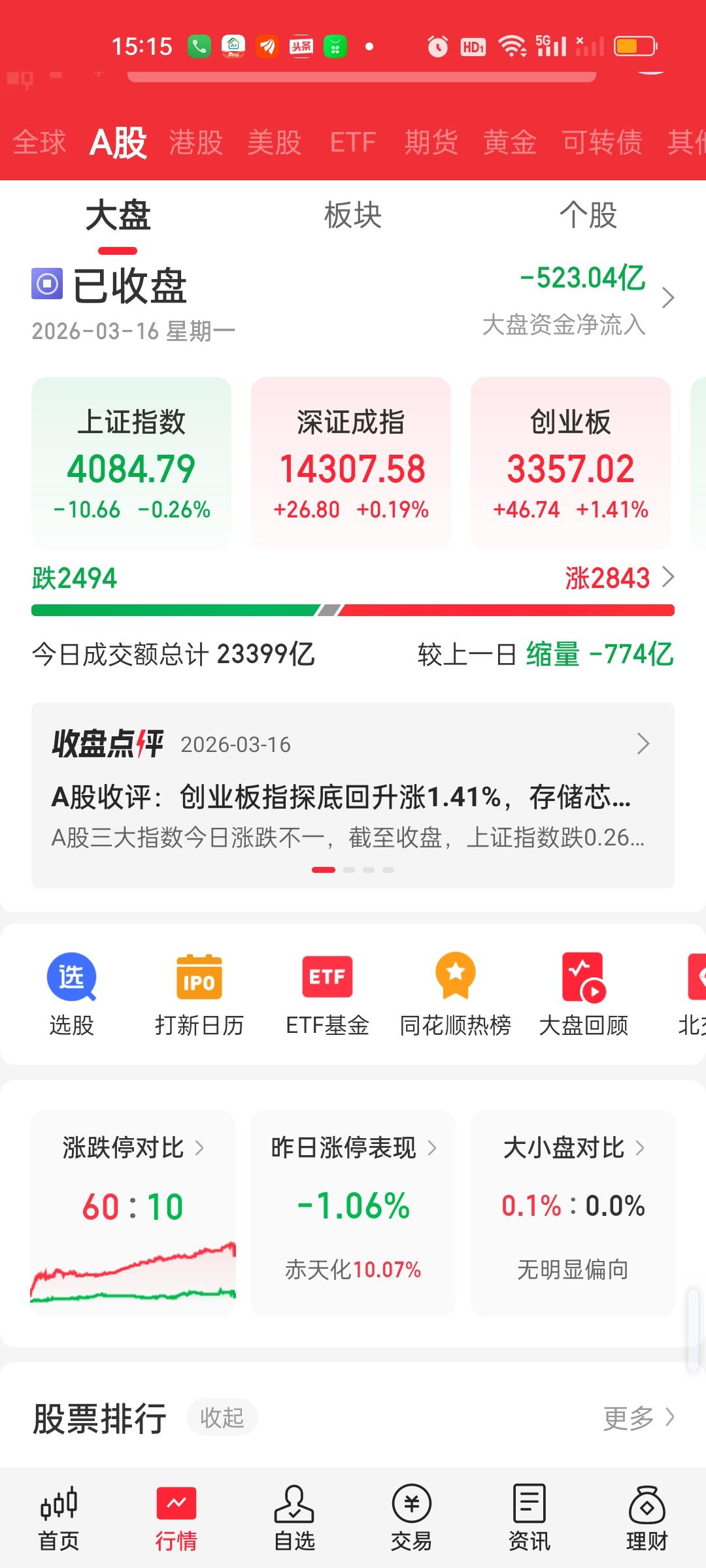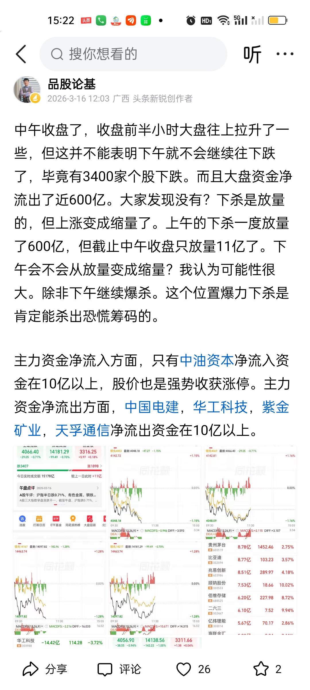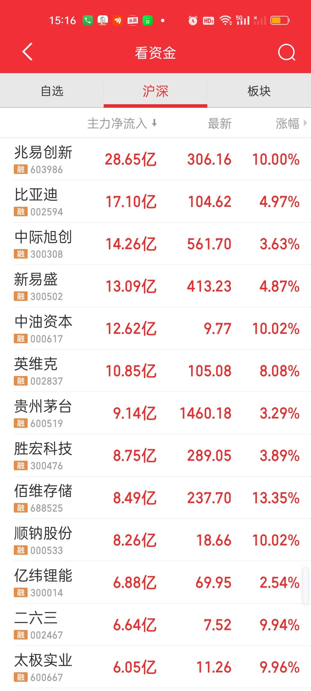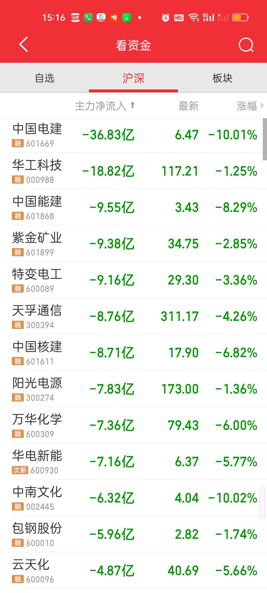 收盘了,中午收盘的时候对下午的走势有一个判断,如果下午继续上涨成交量肯定从放量变成缩量,只有继续爆杀才能放量。因为只有暴力下杀才能让恐慌的人割肉。 下午大盘资金实际是净流入70亿的,但成交量缩了11+774=785亿。上涨家数比上午收盘时多了1000家,涨跌停比从上午的38:7变成了60:10,所以今天尽管大盘收了绿盘,但有2800多家个股上涨,有60家个股涨停,严格的说今天还是有赚钱效应的。 主力资金净流入方面,上午只有中油资本一只个股净流入资金超10亿,下午增加了兆易创新,比亚迪,中际旭创,新易盛,英维克,其中后面三只都来自CPO板块, 主力资金净流出方面,只有中国电建和华工科技净流出资金在10亿以上。相比上午减少了两家。