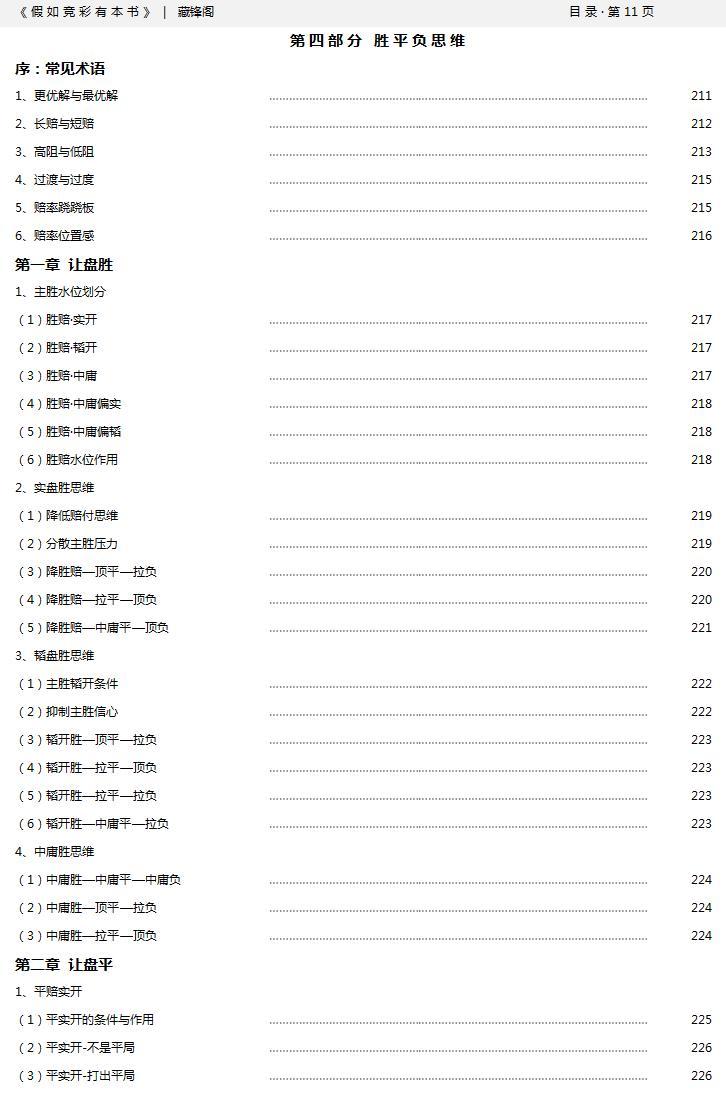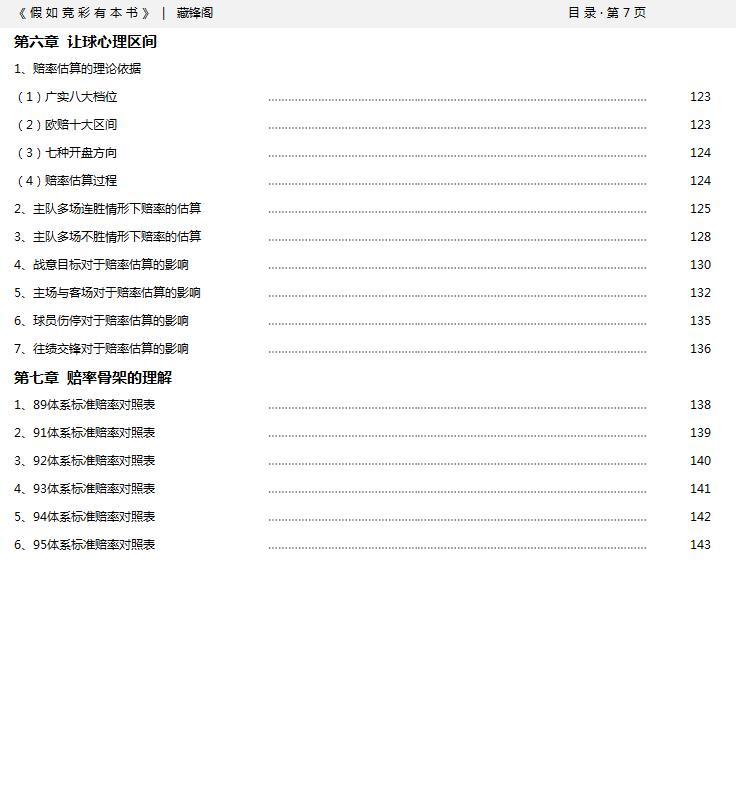 头条号断更应该有快两年了吧,其实这两年也没有闲着,陆陆续续的收集和整理了不少的资料,年前拿出了一部分,做了一个内部资料,权且就叫《假如竞彩有本书》吧。 这套资料已经正式完结,大概有300多页,25万余字,囊括了亚指、欧指、广实、四大分布、胜平负思维五大章节,资料里都是一些通俗易懂的内容,特别适合那些竞彩新手当做入门指南来用。 从今天开始,这套资料会持续更新发送到今日头条,都是现成的完本资料,争取天天更新,欢迎友友们关注和订阅,有什么不足的地方,也真诚欢迎条友们的评论和指导。