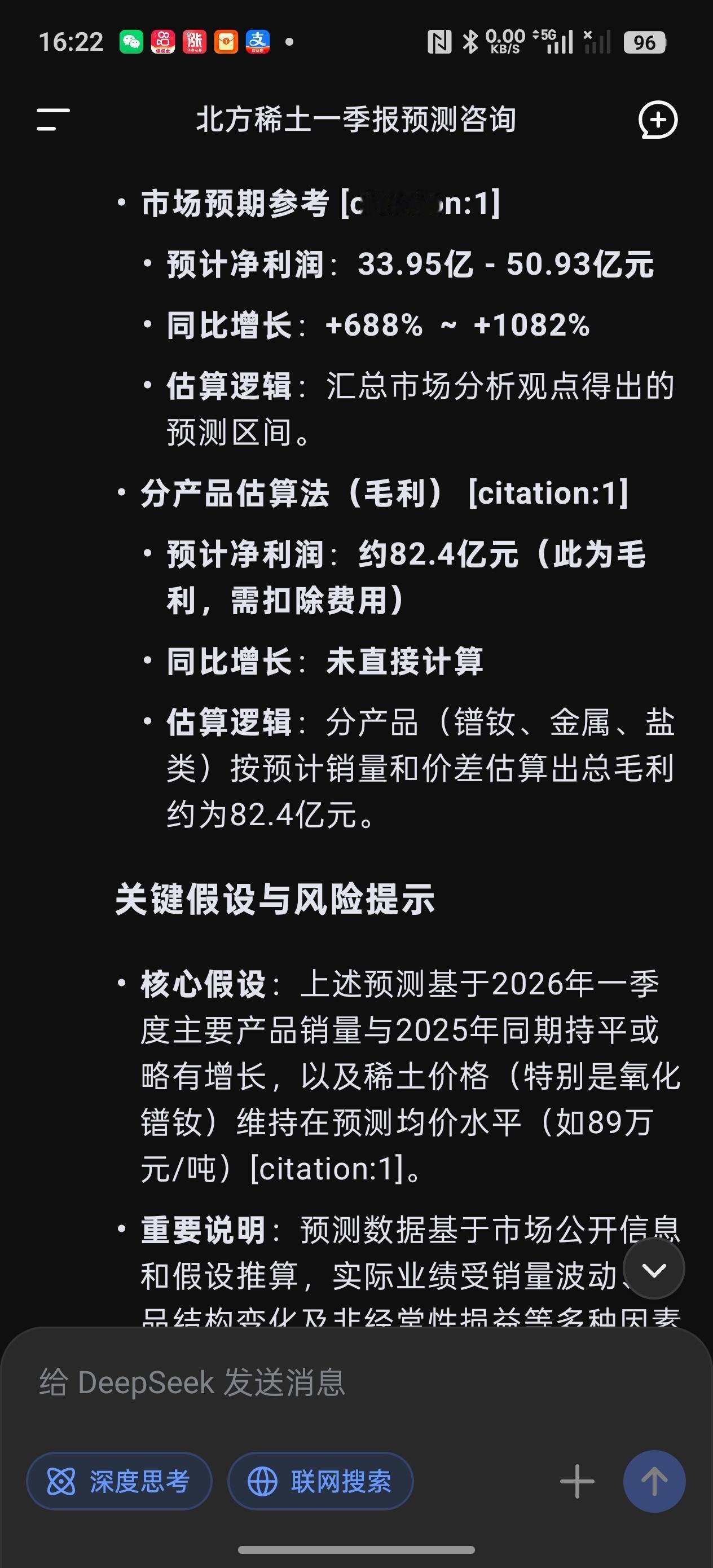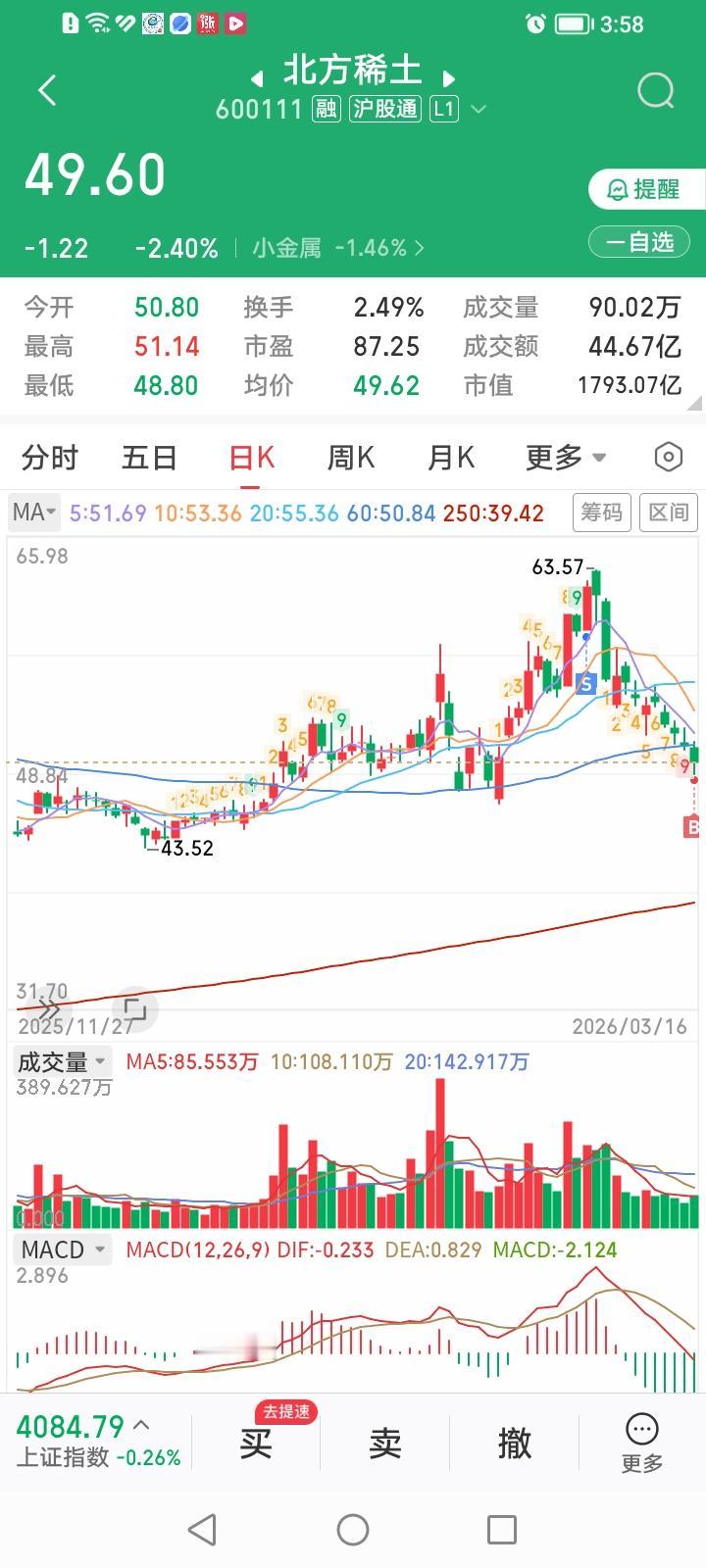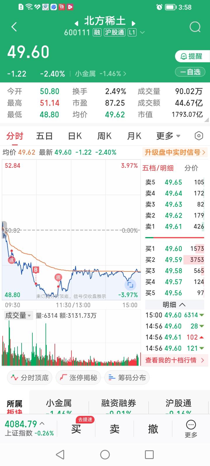 完犊子了,今天逆势买入北方稀土可能又下手早了! 今天一开盘挂了个49.66元的买入北方稀土的买单,见北方稀土跌势凶猛,就撤单挂了个49.22元的买单,于10:28分成交,随后北方稀土股价继续回落,最低跌到48.80元。唉,接下跌的股票如同接下落的飞刀,实在难接啊! 之所以冒险买入北方稀土,基于如下三个原因: 1、北方稀土股价从3月2号的63.57元11个交易日跌到今天最低价48.80元,最大跌幅23.2%,股价飞流直下,跌势太流畅了,感觉主力不像在出货,更像在洗盘。 2、昨天搜了一下deepseek,竟然预测北方稀土一季报业绩可能大增700%,不知道是否靠谱? 3、咱在61.99元卖出了北方稀土,现在49.22元接回来,如果接错了,设好止损点,及时止损完事。