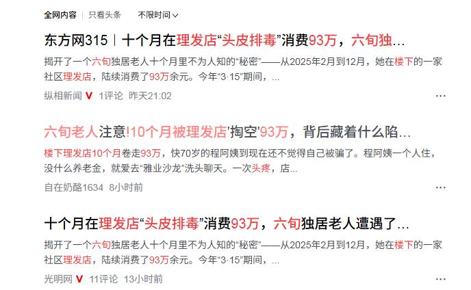 太坑人了!”上海,一6旬阿婆头疼,被楼下理发店忽悠头皮排毒,10个月花了93万,没钱了,阿婆就把20万劳力士卖了8万,上午刚卖掉,钱下午就进了理发店账户,阿婆女婿发现岳母到处借钱,感觉不对劲,一查银行卡,吓得倒吸一口凉气,岳母名下几张银行卡都空了,钱都进了理发店口袋。阿婆:理发店说我头皮毒素多,轻则住院开刀,重则要了命。理发店:出于“人道主义”,愿意补偿阿婆2万。 程阿姨今年快70了,一个人住,养老金不算多。楼下那家"雅业沙龙",她当成了消遣地——洗洗头,拉拉家常,日子就这么过着。直至一日,她头部蓦地剧痛难忍,那钻心之痛仿若汹涌潮水,铺天盖地般将她彻底席卷,令她几近崩溃。 店员听说后,神神秘秘把她带上了二楼。那里摆着一台所谓的"毒素检测仪",屏幕上跳动的数字让店员脸色一沉:"阿姨,你看这毒素指标,再不排出来就得开刀,严重了命都保不住。"程阿姨当场就慌了。店员趁热打铁,压低声音说:"我们这儿有老顾客,就是不肯做排毒,后来人走了……话语虽未言尽,然其深意已昭然若揭,即便言语戛然而止,那蕴含的意味也足以让人清晰领会。 头皮排毒,一次两三万。而后,项目升级为全身排毒,收费标准可谓高企。其单笔消费起始金额竟高达10万,门槛之高令人咋舌。程阿姨像着了魔,十个月里往这个无底洞砸了93万。她狠下心来,将价值二十万的劳力士女王款以区区八万贱卖,仿佛是忍痛割舍一份往昔的奢华。上午,刚自当铺将钱款取出,未到黄昏,这笔钱便流转进了理发店的账户 。 店里有位名为“阿旺”的技师,与老板的情谊深厚非常。在老板心中,阿旺的亲近程度甚至远超亲儿子,二人关系亲密无间。送水果、帮跑腿,把老人哄得服服帖帖。每次收完钱,他都会叮嘱一句:"咱这好事千万别跟儿女说,他们不懂,是害你。"就这一句话,让程阿姨守口如瓶。 直到今年1月,她开始四处借钱。女婿察觉不对劲,火急火燎跑去查银行流水,几张卡的余额全部清零,所有钱都流向了那家理发店。 真相大白后,媒体暗访曝光:那台糊弄人的检测仪早就过期好几年了,整个就是一场表演。店里只有剪发资质,连半点医疗许可都没有。可店方的态度更让人火大。负责人换了副面孔,拒不认账,把"毒素"改口成"角质层",试图把事儿赖个干净。最后只肯给2万块"人道补偿",93万血汗钱,就值这个价? 律师一眼看破:用"不排毒就死"这种假话骗人签单,涉嫌诈骗。按照法律"退一赔三"的准则,店方应该赔偿近400万。最令人心酸不已的是,直至今日,程阿姨依旧未曾意识到自己已然受骗。她宁愿相信骗子的甜言蜜语,也不愿相信现实,甚至还帮着商家遮掩。 这就是很多"银发陷阱"的毒辣之处:它不仅掏空了老人的钱袋子,还利用孤独和恐惧紧紧捆绑了老人的心。防范这种吸血陷阱,光喊着让老人长记性根本不够。做儿女的得多回家守着,监管部门也该硬气起来。 我们奋斗一辈子的保命钱,应该花得舒心,而不是整天提心吊胆怕被人偷走。
