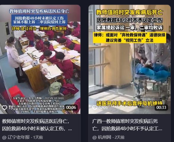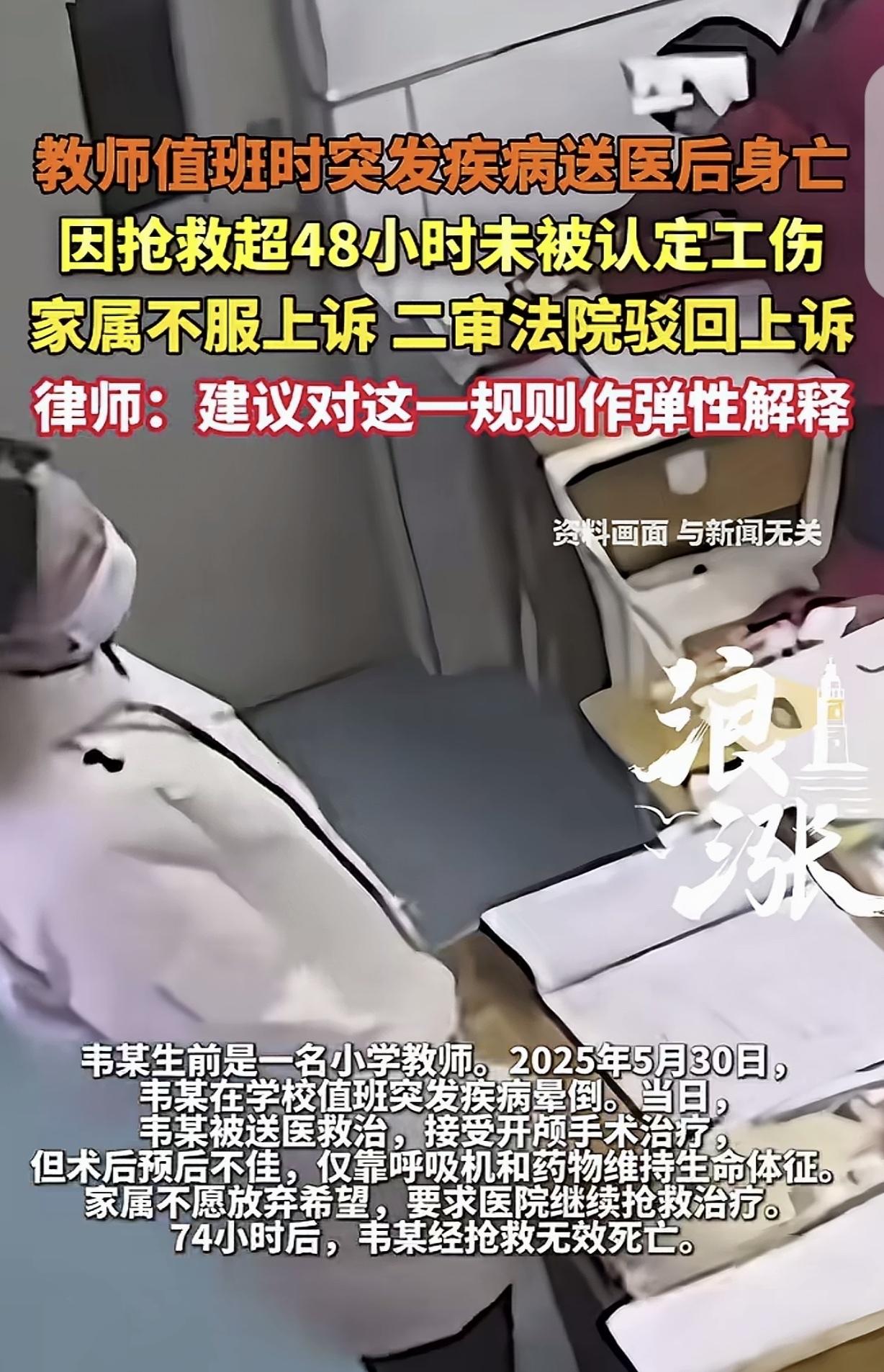 广西贵港,一女老师值班时,突然发病晕倒,送到医院做了开颅手术,74小时后,女子还是抢救无效死亡。学校给女子申请工伤,却被以抢救超48小时驳回,家属不服,认为女子发病不到24小时就脑死亡,是家属不愿放弃要求医院继续抢救超时的,家属告到法院,一审败诉后,又提起上诉,二审判决大大出乎意料。律师:应该把“脑死亡”纳入法定死亡标准。 广西贵港那位女老师的事,让人心里堵得慌。 2025年5月30日,韦老师值班时后脑勺突然像被什么东西砸了一下,话还没说出口,人就直挺挺倒在了地上。120一路狂奔,医生看完片子额头全是汗:"必须开颅,现在就开。"手术虽已顺利完成,然而患者却仿若坠入幽深海底,被无尽的黑暗与寂静所笼罩,任凭外界百般呼唤,依旧沉沉昏睡,毫无苏醒迹象。呼吸机呼哧呼哧响着,药水一袋接一袋往里灌,心电监护仪上那条绿线还在跳,但医生私下跟家属说得很明白,脑子已经不行了,这是在第一天不到24小时的时候。 家里人不信这个邪。守在ICU门口,眼睛熬得通红,逢人就说:"只要还有一口气,就不能放弃。就这般顽强地硬撑着,时光缓缓流逝,直至第74个小时,生命的烛火最终还是熄灭了,斯人悄然离去。 学校颇为仗义,迅速为家属递交了工伤申请。其当机立断之举,既显担当,也让家属在艰难时刻感受到了一份温暖与支持。大家都觉得这事板上钉钉,人是在岗位上倒的,这还能有什么说法? 结果人社局那边一盆冷水泼过来:对不起,抢救超过48小时了,不符合规定。家属当场就炸了:"医生第一天就说脑死亡了,后面是我们不甘心才继续抢救的,这也算我们的错?" 规矩既定,自当恪守。《工伤保险条例》第15条明晰规定:于工作岗位突发疾病,在48小时之内经抢救无效死亡的,可视同工伤。韦老师的死亡证明上写的是74小时,多出来的26个小时,成了一道过不去的坎。 此事最为讽刺之处究竟何在?家属的孝心,反倒成了失去补偿的理由。你说他们该怎么选?第48小时的时候拔掉呼吸机,保住工伤认定,但一辈子背着"见死不救"的心结?还是继续抢救,尽到人伦义务,但最后连一分钱补偿都拿不到? 家属对此裁决不服,愤懑难平,毅然决然地将人社局诉至法庭,欲通过法律途径讨回公道,捍卫自身权益。一审法官翻开卷宗,看着那张死亡证明,判了个"驳回",人社局按规矩办事,没毛病。 二审还是一样的结果。法官的逻辑很简单:法律得讲一致性,48小时就是48小时,多一分钟都不行。判决书是盖章了,可留下的问号还在发酵。 医学界早就认了脑死亡这回事,脑组织停止电活动,就是真的没了,后面全靠机器在那儿演戏。可我们的法律还停在"心跳停了才算死"的年代,这中间的时间差,就成了一个巨大的黑洞。 上海有个案例,患者在转运回家途中去世,法院认定那也算抢救状态,最后判了工伤。到了韦老师这儿,同样是抢救,同样是家属不放弃,结果却天差地别。律师说得直白:"脑死亡"得赶紧写进法律里去。不然这种哑巴吃黄连的官司,还得一茬接一茬地打。 48小时这个数字,本来是为了保障劳动者权益设的。可现在它变成了一把尺子,冷冰冰地量着每个家庭的选择,你敢多爱一会儿,就得付出代价。 韦老师的家人输掉了官司,但这个案子留下的裂痕,远比判决书上的字要深得多。一个在ICU外守了74小时的家庭,最终输给了一个写在1996年的数字。这个数字,还要锁住多少个类似的故事?