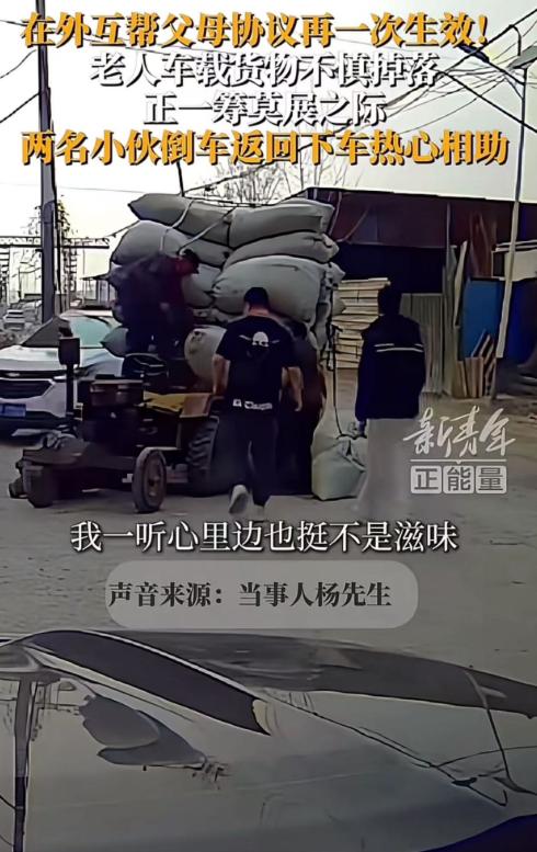 “在外互帮父母协议再一次生效!”河北定州,一对老夫妻开拖拉机载货,途中货物脱落,老人因为岁数大,搬不动货物一脸着急。正一筹莫展之际,两名小伙热心相助,他们说的一句话让全网泪目! 开拖拉机的大爷双手紧紧握着方向盘,眼神专注地盯着前方的路,时不时还侧头看看身边的老伴。 那辆老拖拉机就这么慢悠悠地往前挪着,发动机“咚咚咚”地响个不停。 走着走着,前面出现了一段有些不是很平整的路,坑坑洼洼的全是碎石子,大爷下意识地放慢了车速。 可拖拉机还是猛地晃了一下,大爷和大娘心里同时一揪,不约而同地探着身子往车斗里瞅。 还没等他俩反应过来,就听见“哗啦”一声脆响,紧接着就是好几声“咚、咚”的闷响。 只是片刻,好几袋鼓鼓囊囊的货物就顺着车斗边缘滑了下去,滚到路边的上,横七竖八地堆在那儿。 大爷赶紧踩下刹车,拖拉机“吱呀”一声停了下来。 大娘也跟着慢慢下车,两人快步走到散落的货物旁,看着满地的东西,脸上瞬间露出了着急的神色。 大爷弯腰,伸手想去搬其中一袋货物,他双手抓住袋子的边缘,使劲往上提,可他根本提不动。 他喘着粗气,又试着搬了一次,还是没能搬起来,反而因为用力过猛,身子晃了一下,差点摔倒。 大娘赶紧上前扶住他,语气里满是焦急:“你慢点,别着急,咱搬不动就再想想办法。” 大娘也试着弯腰去搬,她双手紧紧拽着袋子,可那袋货物对她来说,实在是太重了,搬了半天,也只是把袋子挪了一点点。 他们知道,自己年纪大了,身体不如从前,这几袋货物,凭他们两个人的力气,很难搬回拖拉机上。 可这些货物,要是丢在这里,损失可不小。 大爷又一次弯腰搬货物,搬了没一会儿,就忍不住咳嗽起来,咳嗽声断断续续,听起来很吃力,大娘赶紧上前,轻轻拍着他的后背,眼里泛起了泪光,却又强忍着没掉下来。 就在这时,一辆小汽车从远处驶了过来,驶过老两口身边的时候,司机突然放慢了车速。 随后,司机探出头看了看满地的货物,又看了看一脸焦急、手足无措的老两口,然后停下了车。 车门打开,从车里下来两个小伙。 其中一个小伙直接弯腰抓住了一袋货物的边缘,另一个小伙也赶紧上前,两人对视一眼,一起使劲,“一二,起!”一声轻喝,就把那袋沉甸甸的货物抬了起来,稳稳地往拖拉机里放。 老两口看着两个小伙热心帮忙,眼里露出了感激的神色,连忙说道:“孩子们,太谢谢你们了,但是我们自己来吧,别把你们的衣服给弄脏了。” 老两口一边说,一边想上前自己弄,却被其中一个小伙拦住了:“脏了洗洗就好!大娘,您别动手,您和大爷就在旁边歇着,这点活交给我们就行,我们年轻,有力气。” 他们搬得很认真,每一袋货物都稳稳地抬起来,轻轻放在车里,然后仔细摆好。 有的袋子摔开了口,他们还会小心翼翼地把漏出来的东西装回去,再用绳子简单捆一下,防止再次掉落。 大爷大娘站在旁边,看着两个小伙忙碌的身影,嘴里不停地说着谢谢。 就这样,两个小伙一趟又一趟地搬着货物,从路边搬到拖拉机上,重复着同样的动作,累得气喘吁吁,胳膊也有些发酸,可他们的脸上始终带着笑容,没有一丝不耐烦。 做完这一切,两个小伙才直起腰来,伸了伸胳膊,擦了擦脸上的汗和尘土,脸上依旧带着笑容。 发动汽车之前,他们还摇下车窗,对着老两口挥了挥手,脸上依旧带着温暖的笑容,然后车辆缓缓驶离。 老两口站在路边,看着车辆消失的方向,久久没有移动脚步,脸上的泪水还没有干,嘴角却露出了欣慰的笑容。 大爷重新发动拖拉机,发动机依旧发出“突突突”的轰鸣声,可这一次,老两口的心里没有了焦急和无助,只剩下满满的温暖和感动。 这段暖心的画面被发到了网上后,网友都被这两个小伙的善举打动了。 有网友说:“我们每个人都有父母,都害怕自己的父母在外遇到困难,无人相助,所以当看到别人的父母身陷窘境时,伸把手,其实也是在为自己的父母积攒温暖。” 也有网友说:“这就是刻在中国人骨子里的善良,这两个小伙,用最简单的行动,诠释了当代青年的担当。”
