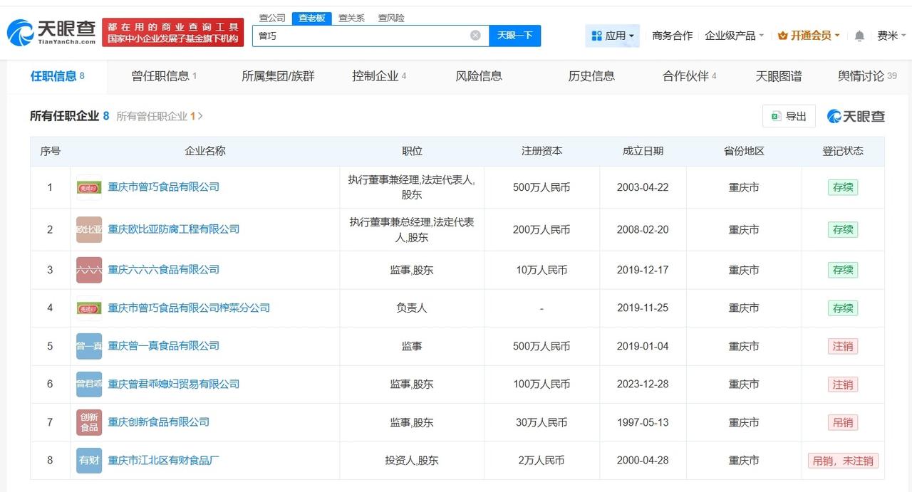 315曝光鸡爪公司老板名下公司被吊销 乖媳妇鸡爪老板名下关联8家企业 315曝光的鸡爪公司股东也在看晚会 据媒体报道,央视315晚会曝光乖媳妇鸡爪关联公司,记者致电发现其股东曾巧正在观看晚会。 天眼查任职信息显示,曾巧名下关联8家企业,其中4家企业处于存续状态,包括乖媳妇鸡爪关联公司重庆市曾巧食品有限公司、重庆欧比亚防腐工程有限公司等,曾巧在乖媳妇鸡爪关联公司担任执行董事兼经理、法定代表人并持有该公司股份,其他4家企业已注销或被吊销。 天眼查信息:-c303247580