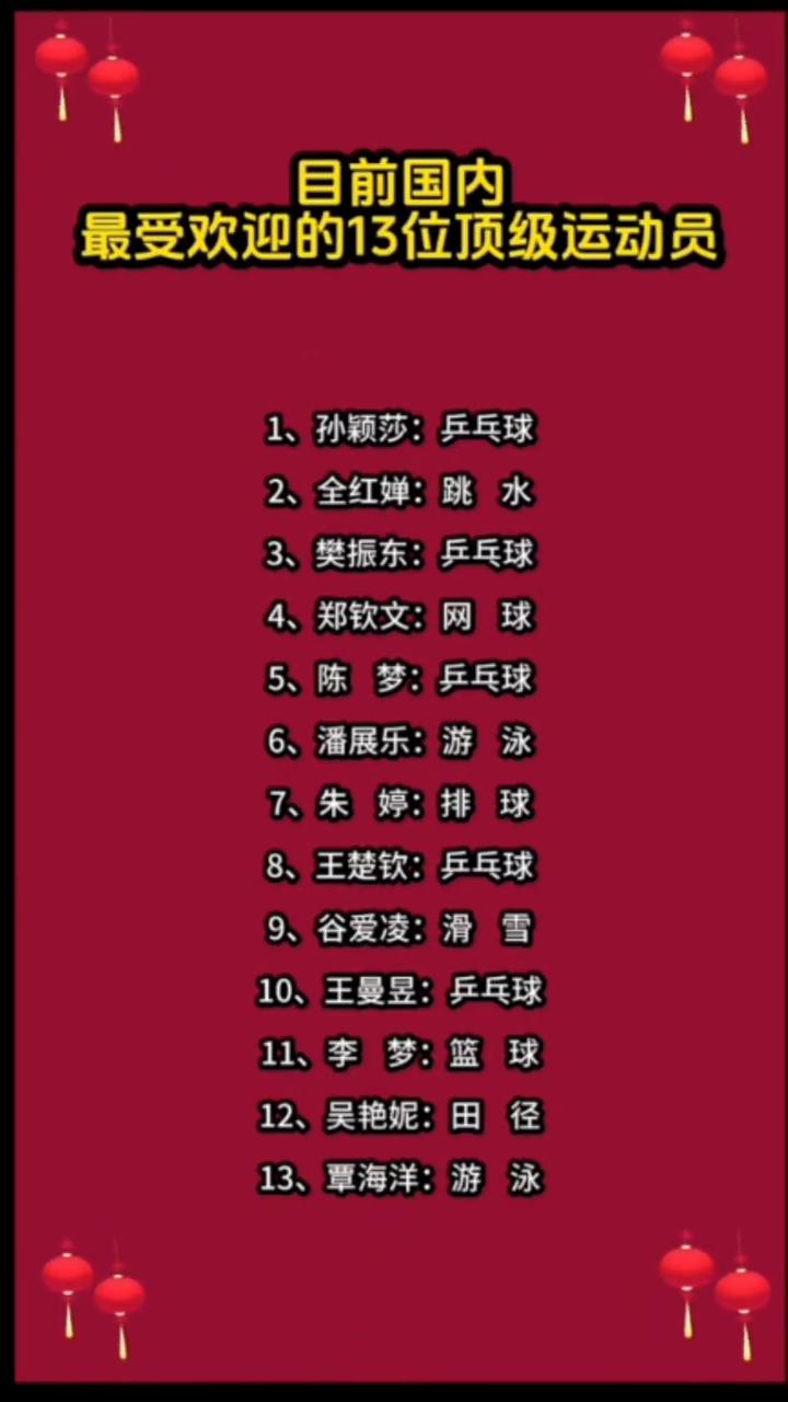 目前国内最受欢迎的13位顶级运动员。 ·1、孙颖莎:乒乓球。 ·2、全红婵:跳水。 ·3、樊振东:乒乓球。 ·4、郑钦文:网球。 ·5、陈梦:乒乓球。 ·6、潘展乐:游泳。 ·7、朱婷:排球。 ·8、王楚钦:乒乓球。 ·9、谷爱凌:滑雪。 ·10、王曼昱:乒乓球。 ·11、李梦:篮球。 ·12、吴艳妮:田径。 ·13、覃海洋:游泳。