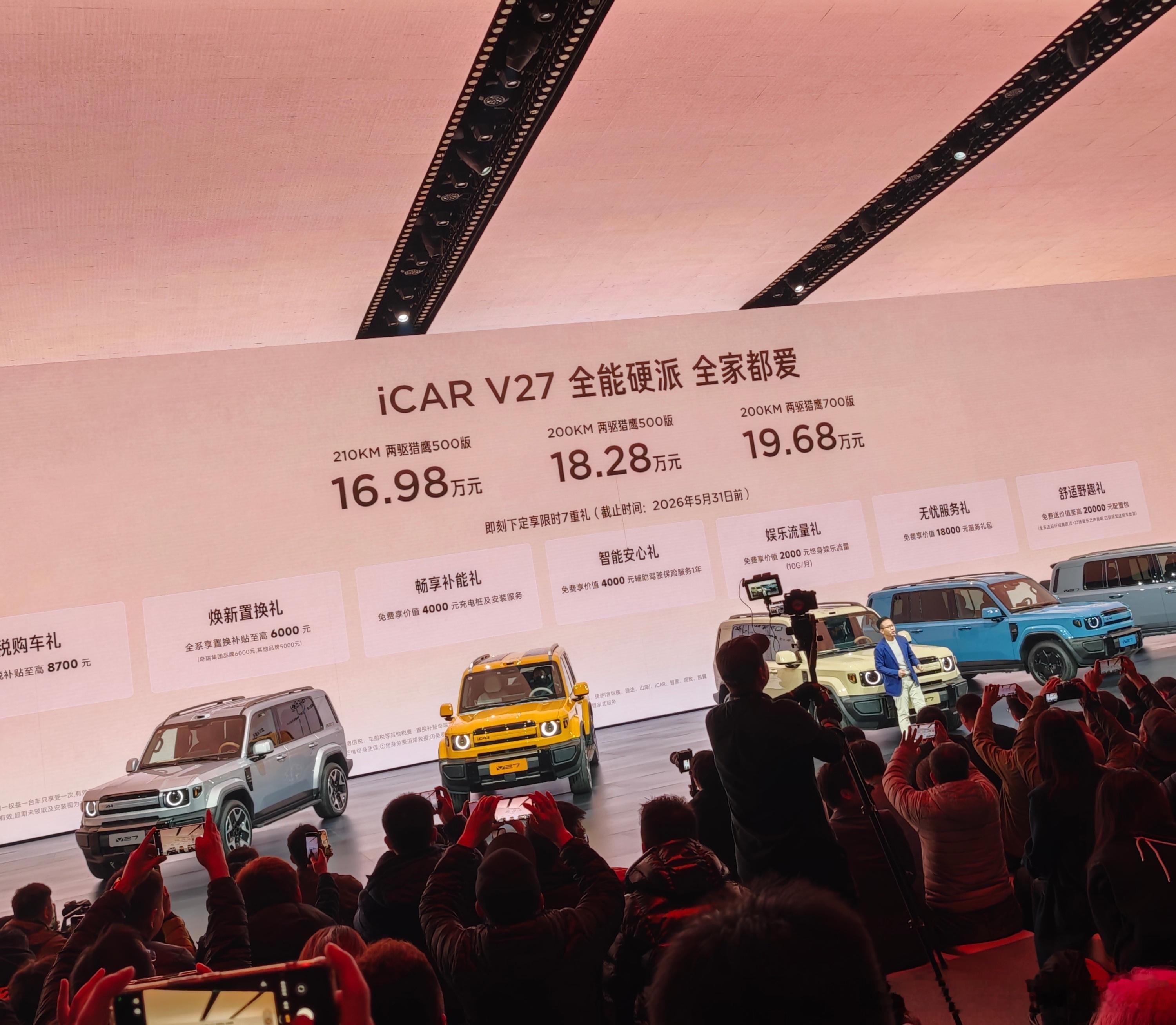 3月13日晚上7点,iCAR(也就是你说的埃卡尔)V27正式上市了!定位“家庭新硬派”,主打全能出行,价格和权益都挺实在。