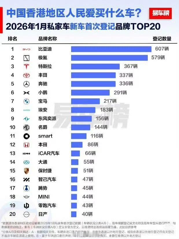 2026开年再夺1月销冠,极氪、小鹏等国货品牌也涨幅亮眼。比亚迪布局10余家香港门店,依托港府电动化政策+港车北上配套,全车型覆盖需求。