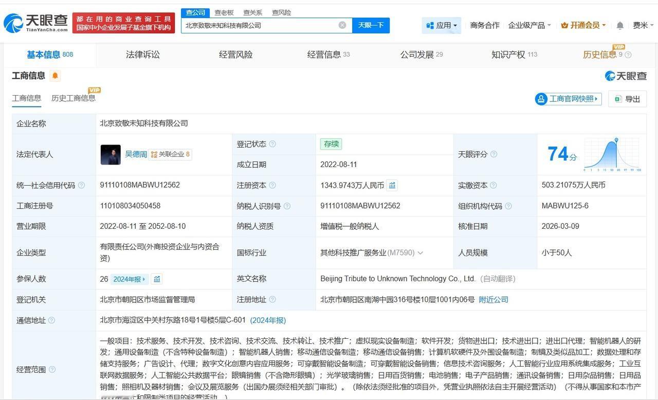 联想等入股AR眼镜研发商致敬未知 天眼查工商信息显示,近日,北京致敬未知科技有限公司发生工商变更,新增联想(北京)有限公司、广发乾和投资有限公司等为股东,同时,注册资本由约1103万人民币增至约1344万人民币。 北京致敬未知科技有限公司成立于2022年8月,法定代表人为吴德周,经营范围含虚拟现实设备制造、可穿戴智能设备制造、软件开发等。股东信息显示,该公司现由深海生物科技(海南)有限公司、海南象行时代科技合伙企业(有限合伙)及上述新增股东等共同持股。官网显示,该公司致力打造可穿戴出门,能日常使用的消费级AR眼镜。 天眼查信息: