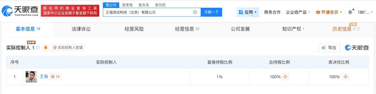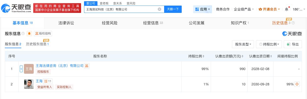 打假第一人王海测评公司起底 王海测评实控人被称为打假第一人 胖东来回应若检测无错会起诉博主 据报道,3月15日晚,胖东来发文回应关于博主“王海测评”发布其销售鲜鸡蛋检出角黄素一事,引发热议。 天眼查App显示,“王海测评”关联王海测试科技(北京)有限公司成立于2022年4月,法定代表人为闫霞,注册资本1000万人民币,经营范围包括进出口商品检验鉴定、检验检测服务等。股东信息显示,该公司由王海法律咨询(北京)有限公司、王海共同持股。值得注意的是,王海为该公司实际控制人。公开信息显示,王海被称为“中国打假第一人”。 天眼查信息: