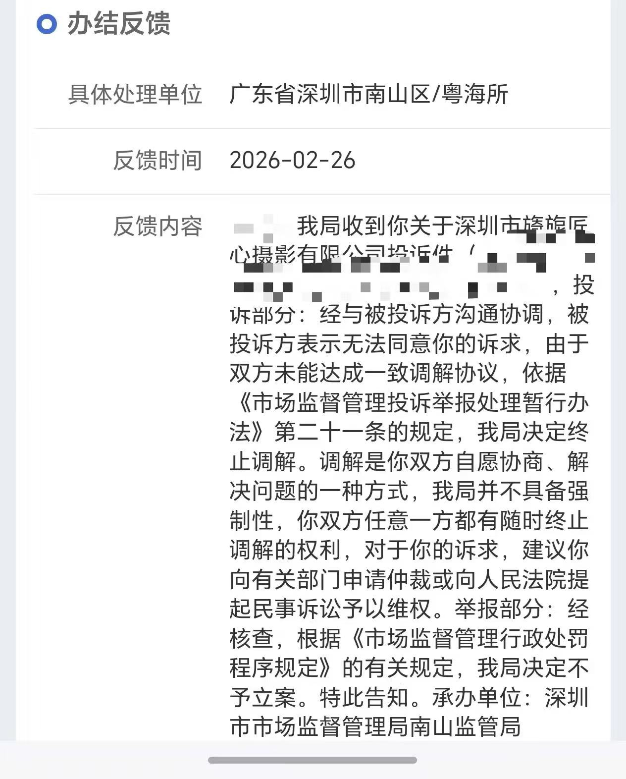 小李称,她将此事向深圳市相关部门进行了投诉举报,但深圳市市场监督管理局南山监管所于2月26日回复称,“投诉部分,由于双方未能达成一致调解协议,我局决定终止调解。关于举报部分:经核查,根据《市场监督管理行政处罚程序规定》的有关规定,我局决定不予立案。”网页链接