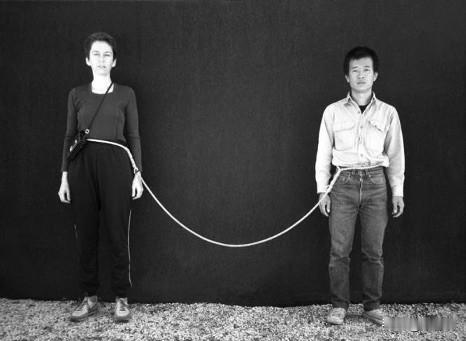 这张图片展示的是由美籍华裔艺术家谢德慶(Tehching Hsieh)和美国艺术家琳达·蒙塔诺(Linda Montano)合作完成的著名行为艺术作品:《一年行为表演 1983-1984》(也常被称为“绳子计划”,Rope piece。) 该作品的核心内容和规则包括: 持续时间:从 1983 年 7 月 4 日到 1984 年 7 月 4 日,整整一年。 连接方式:两人腰间系着一根长约 2.4 米(8 英尺)的绳子,在这一年里形影不离。 核心禁令:尽管两人始终被连接在一起,但他们约定在这一年内严禁任何身体接触。 生活状态:这一年里,他们的吃喝拉撒、睡觉、工作等所有日常活动都必须在被绳子拴在一起的状态下共同完成。 这件作品探讨了人与人之间极致的亲密、控制、服从以及空间关系的边界。在长达一年的实验后,谢德慶曾坦言这种毫无隐私的状态让两人从最初的理性和谐演变成了争吵甚至互相憎恨。