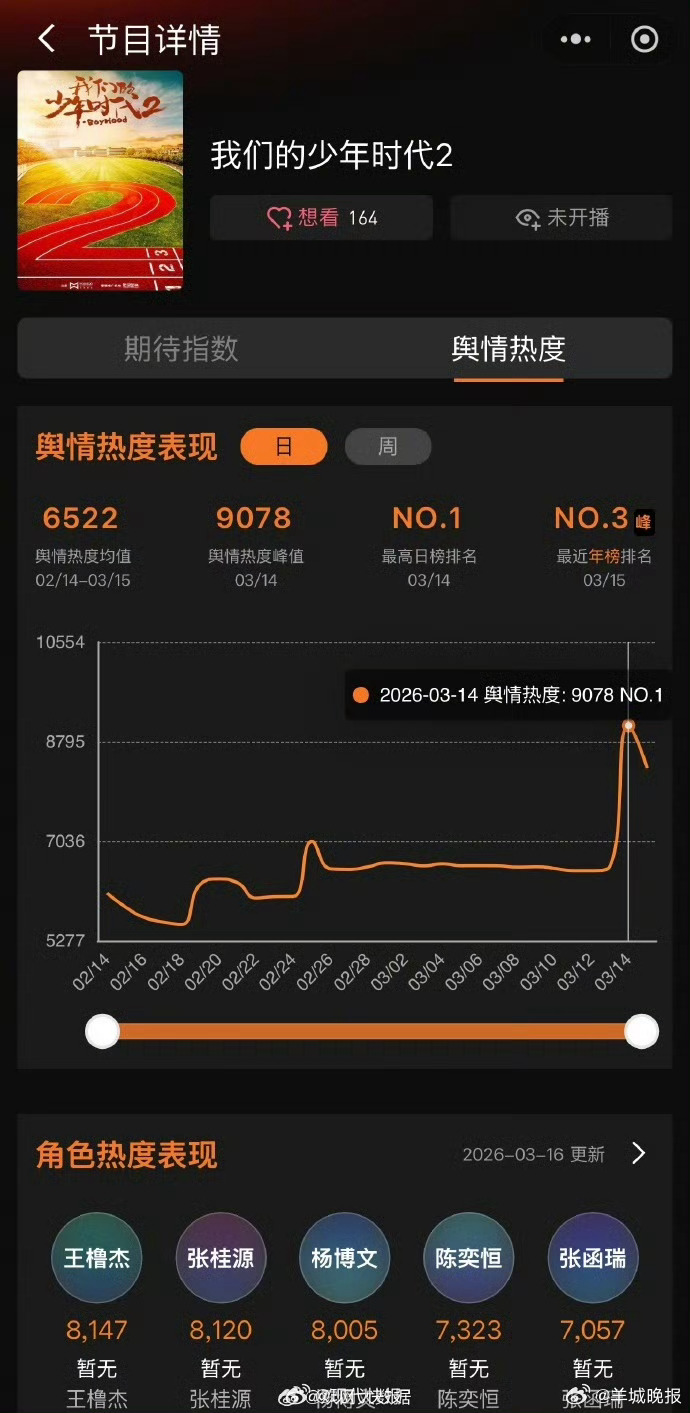 【#我们的少年时代2待播剧热度TOP1#】据:《我们的少年时代2》热度持续飙升,连续2天稳居待播剧舆情热度TOP1!舆情热度峰值高达9078,位列2026待播剧舆情热度年榜第三,人气一路领跑!稳居角色热度榜前三。猜你想看>>#王橹杰语音##姚晨 凌潇肃##九成美直播##王俊凯 王则徐##因为瞿颖盒马的菠菜都标上英文了##九成美转发区##黄景瑜 许魏洲#(现代快报)(编辑:张子皓;审签:谢杨柳)