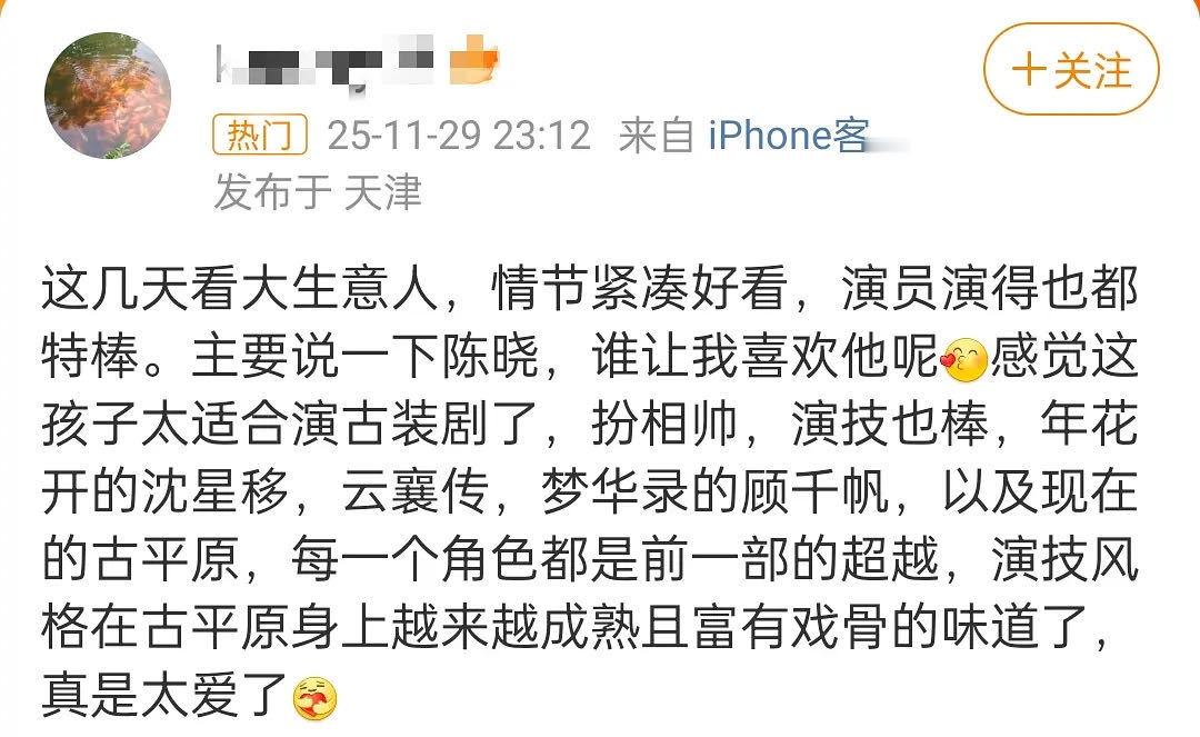 哇噢原来大生意人的陈晓 口碑这么好😧才发现剧播期间好多人被哥的高光演技给打动到🥹讲真,古平原这个人物不好演,大时代中的小人物,既有时代厚重感,也有自身的个人历史沉淀感,多面而复杂。但陈晓给出的答卷近乎满分,从宁古塔流放再到山西掌柜,最后又回到徽州老家创业,历经种种波折与磨练,但不变的却是一颗书生意气的赤胆真心,重情重义,始终忘不了“道义”这两个字。陈晓就近乎完美地演绎出人物一步步的成长,就仿佛是以自身的血肉作为演绎工具,慢慢地把人物叠砌成型,塑造出一个完全真实可信的灵魂!从那年花开月正圆、陆贞传奇,再到人生之路、梦华录,哥的演技实力大家有目共睹,这次白玉兰拿一个视帝提名完全值得哇!我看好这个哥越走越稳、越走越好