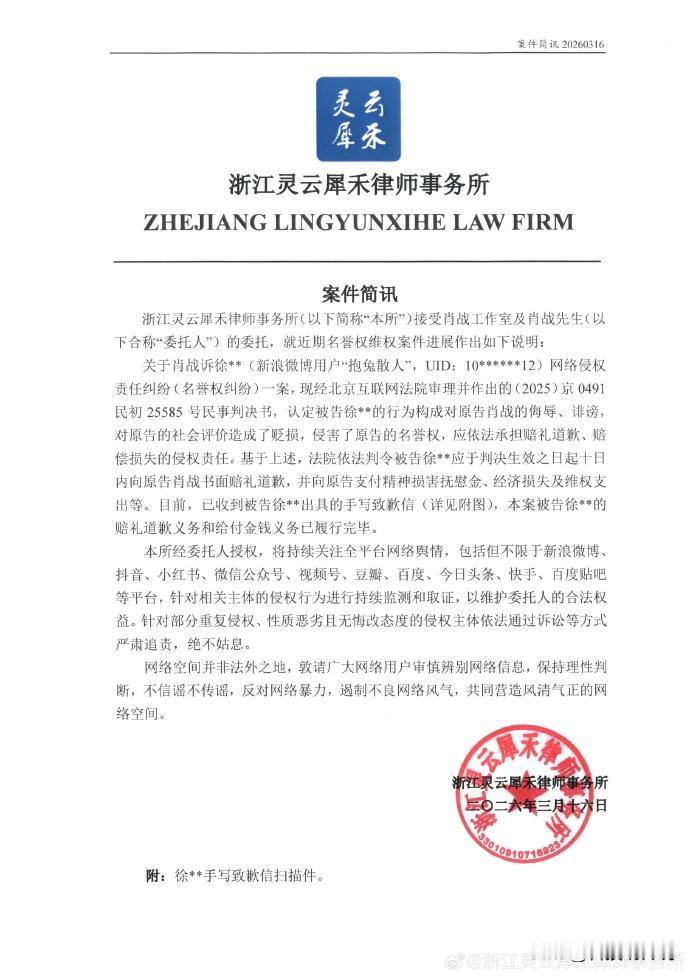 【侵权肖战黑粉被判公开道歉 侵权肖战黑粉手写道歉信】肖战一个emoji代表一个角色 律师事务所接受肖战工作至及肖战先生的委托,就近期名誉权维权案件进展作出说明。目前,已收到被告徐某出具的手写致歉信等。 天眼查App显示,北京互联网法院刊登原告肖战与被告田某网络侵权责任纠纷一案民事判决书。判决田某向原告肖战公开发布致歉声明等。上述判决生效后,田某未履行致歉义务,肖战申请强制执行。 天眼查信息: