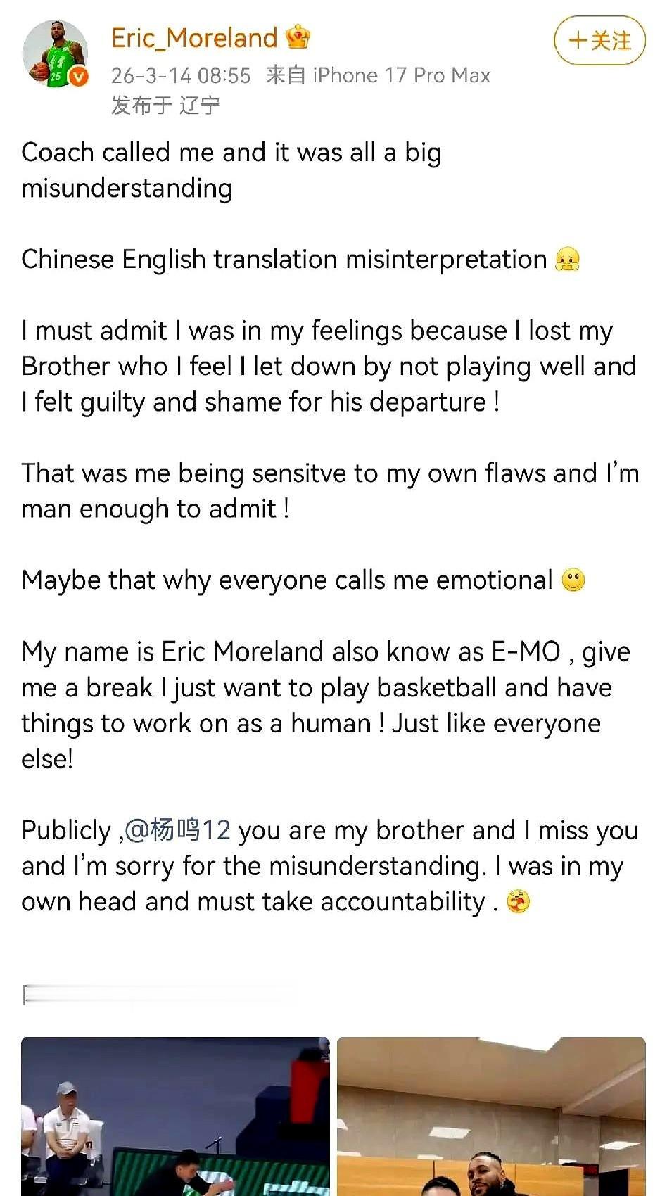 最了解你的人,往往最知道刀子该往哪捅。 辽宁男篮前主帅杨鸣,现在是解说嘉宾。他在点评老东家比赛时,直言昔日爱将莫兰德防守懒散、看心情打球,还不好哄。 话音刚落,莫兰德就在深夜发长文回击,说杨鸣才是那个情绪不稳定的人,辞职后不帮忙就算了,还总说风凉话。一场因为翻译偏差引发的误会,迅速演变成师徒反目的闹剧。 虽然杨鸣主动打电话,两人很快和解。但这事儿点透了一个职场真相:你已经不是人家的领导了。球队刚从四连败的坑里爬出来,正是需要团结和鼓励的时候。你场外一句“为你好”的点评,对正在场上拼命的兄弟来说,就是添堵。 良药未必不苦口,但公开喂药,就不是治病,是添乱。