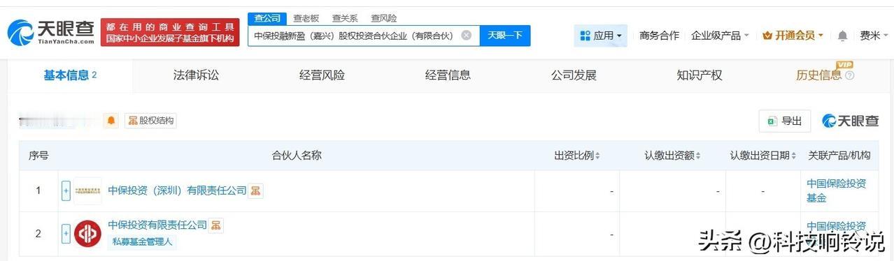 【中保投资在嘉兴成立新股权投资合伙企业 出资额5亿】 天眼查工商信息显示,近日,中保投融新盈(嘉兴)股权投资合伙企业(有限合伙)成立,执行事务合伙人为游虎,出资额5亿人民币,经营范围为股权投资,由中保投资有限责任公司及旗下中保投资(深圳)有限责任公司共同出资。 天眼查信息: