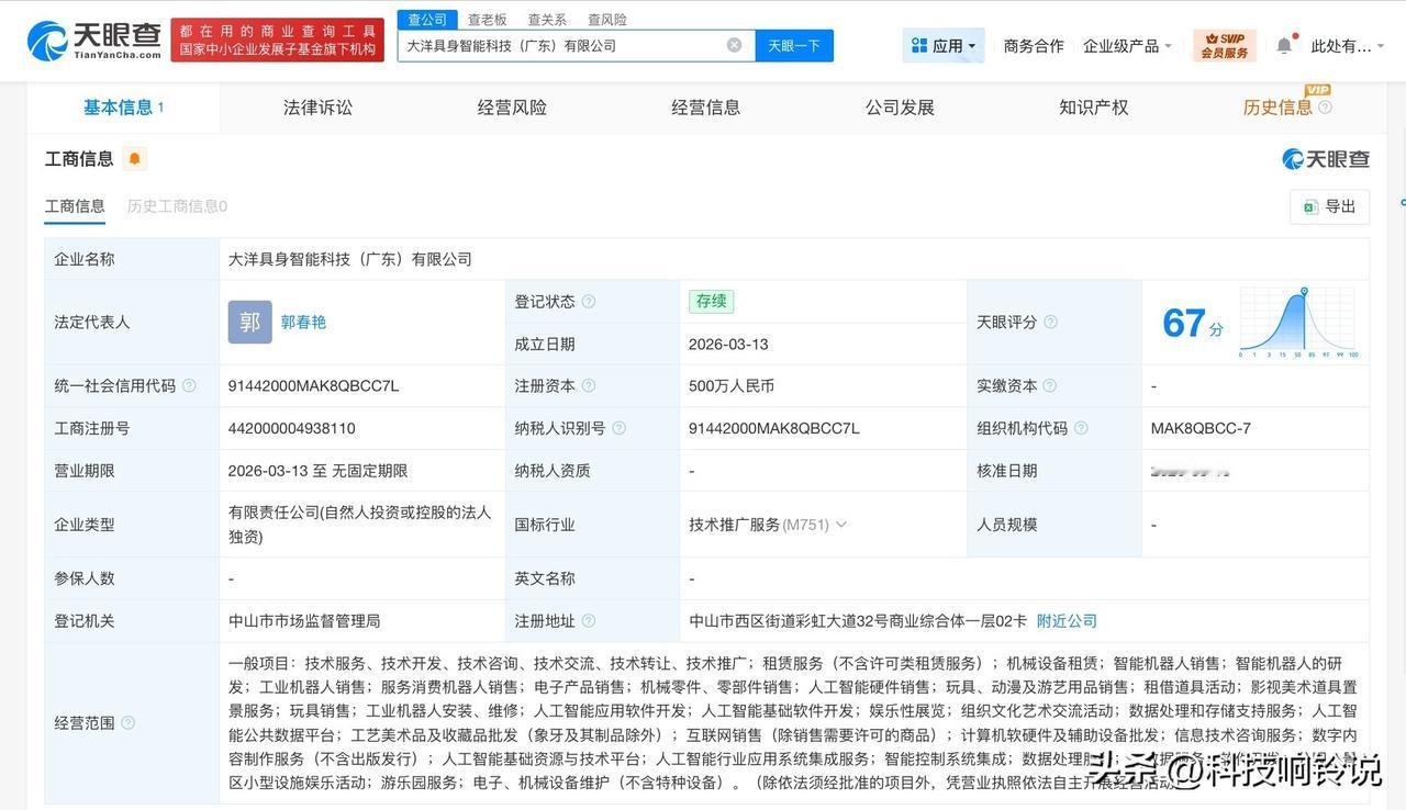 【大洋电机成立具身智能科技公司 注册资本500万】 天眼查工商信息显示,近日,大洋具身智能科技(广东)有限公司成立,法定代表人为郭春艳,注册资本500万人民币,经营范围包括智能机器人的研发、智能机器人销售、工业机器人销售、人工智能硬件销售、人工智能应用软件开发等。股东信息显示,该公司由大洋电机全资持股。 天眼查信息:
