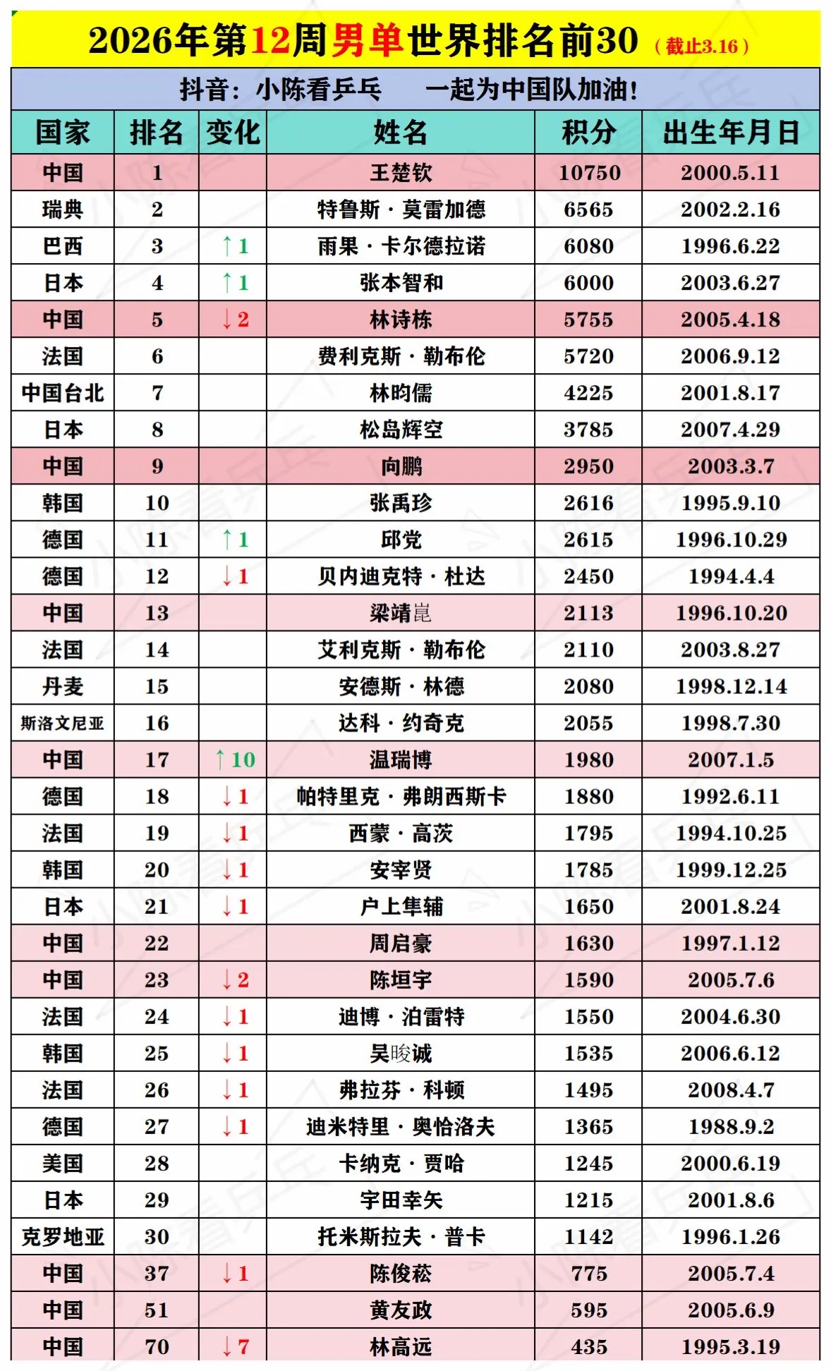 2026第12周乒乓球世界排名单打前30。2026年第12周乒乓球世界排名男女单打前30列表。中国队加油。