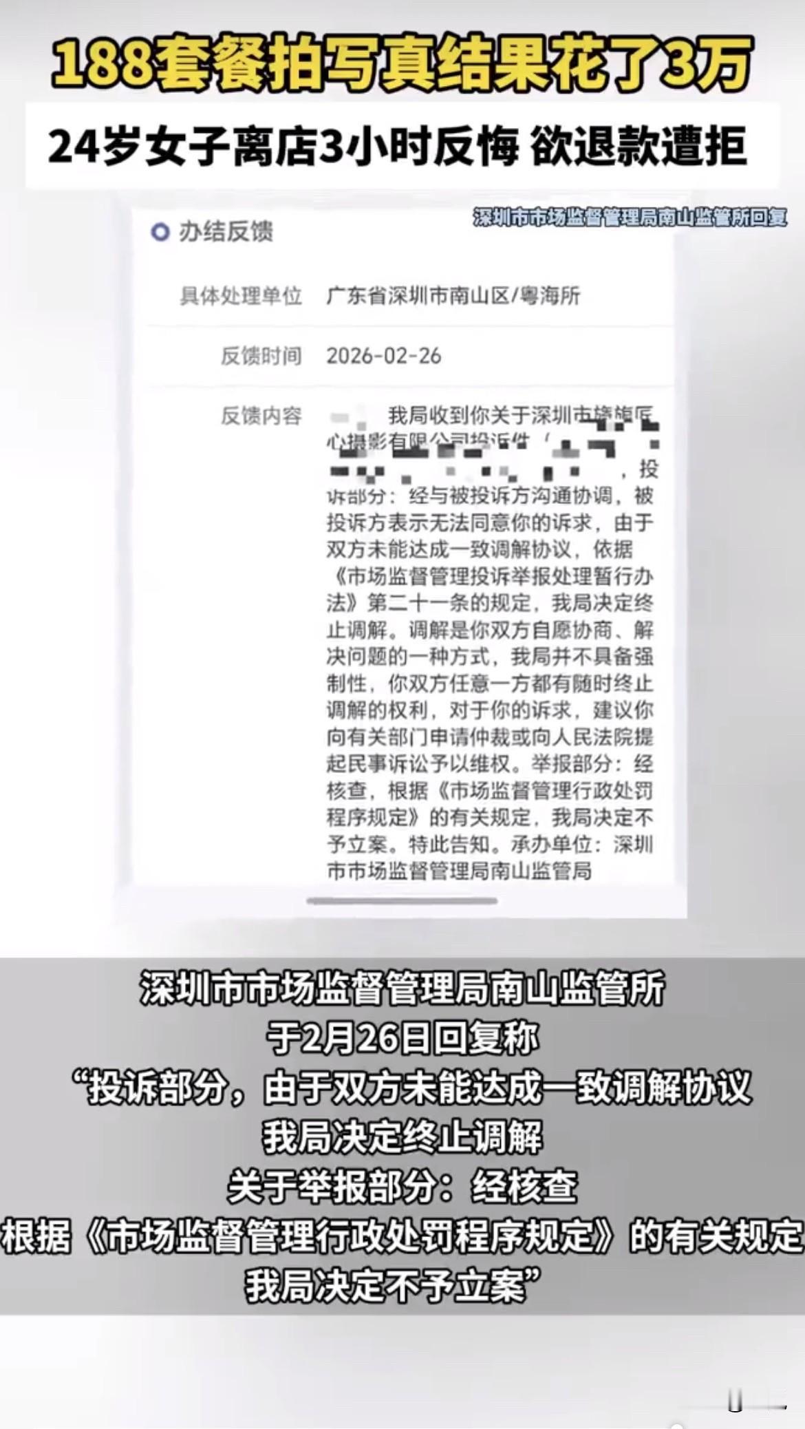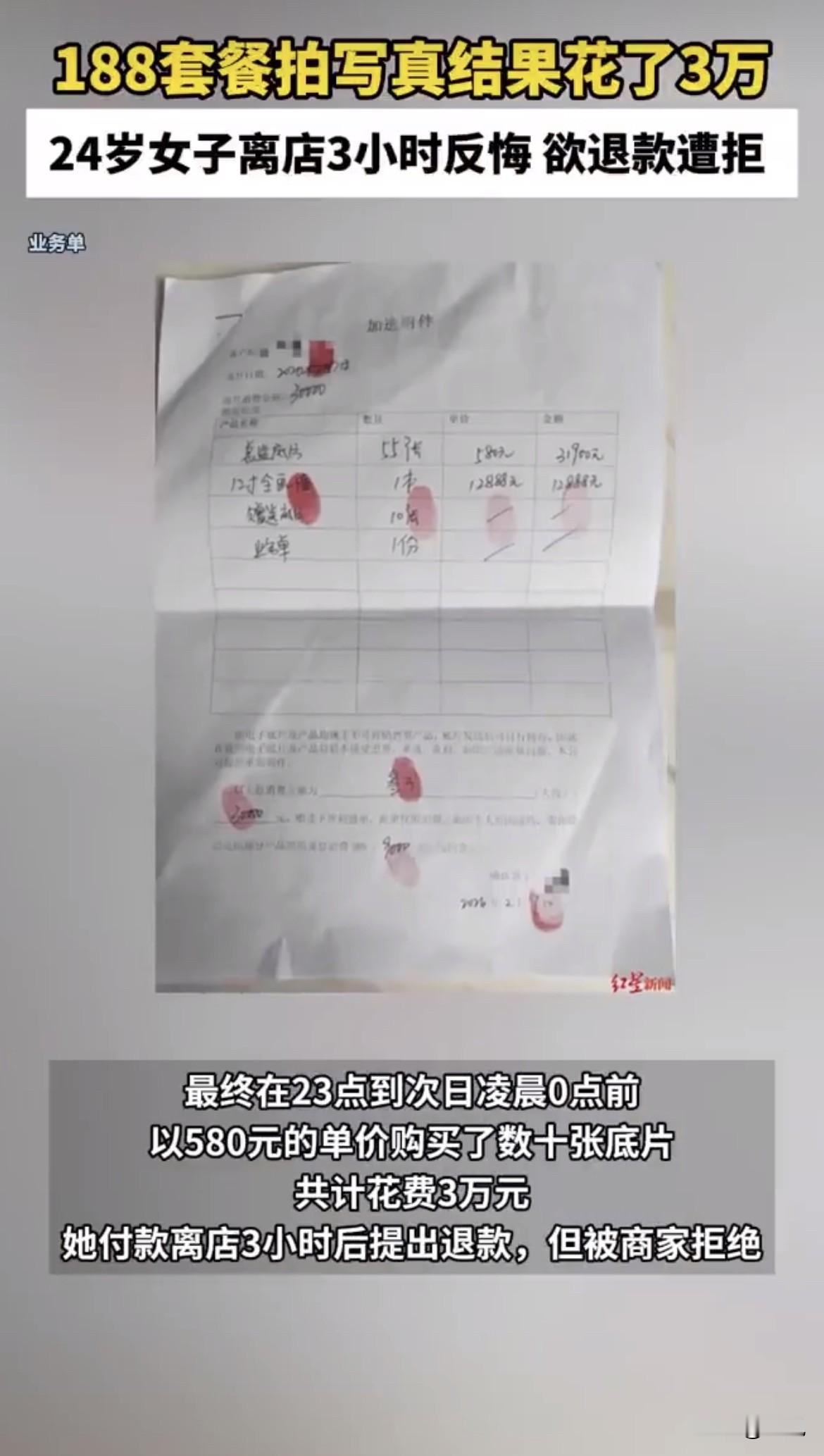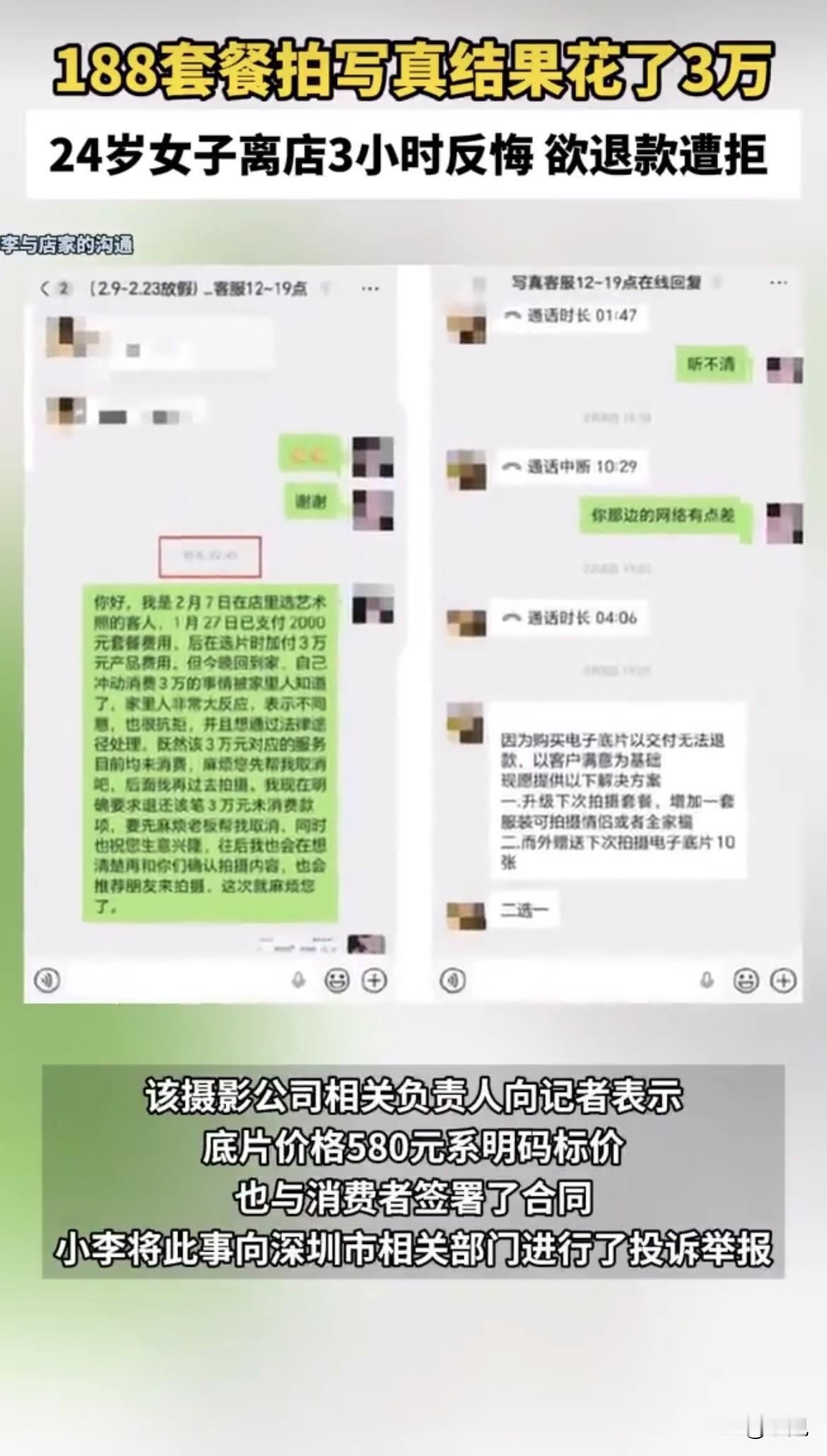 晚上11点,深圳南山区一家摄影店的选片室里,24岁的小李被三个人围着。摄影店老板、摄影师、选片师,把她堵在座位上。她想给朋友打个电话,选片师直接挂了,说选片期间不能视频。等她走出店门,已经是半夜,信用卡刷掉3万块。三个小时后,凌晨两点多,她发微信说要退款。店家第二天晚上回复:底片已经交付,退不了。 这事得从头说。今年1月,小李在网上看到“188元拍2套写真”的广告,价格便宜,就去了深圳Ingenuity摄影。到店后,销售说188套餐衣服选择少、底片不够,拍了也是白拍,转而推荐什么“学生套餐”。小李最后付了2000块,买了第一次的套餐,包含17张精修底片和相册。 重头戏在2月7号晚上选片。小李一个人去的,本来约了朋友,商家说写真私密、选片得专注,暗示她别带朋友。进了选片室,三个人开始轮番轰炸。“这是总监团队拍的,一张底片正常要580”“删了多可惜”“年底最大福利,今天定下来最划算”。小李事后说,当时脑子一片空白,根本插不上话,压迫感太强了。 从晚上11点19分到11点49分,短短半小时,小李通过支付宝转了3笔账:15000、10000、5000。加上之前付的,总共3万块,买了86张精修底片,还“送”了一次拍摄。业务单上写着总监底片55张,单价580元;12寸相框一本12888元;赠送底片10张。下面还有一行小字:底片发送后不接受退费。 注意这个时间点。晚上11点,人在深夜精力下降、判断力减弱,更容易被说服。三个工作人员围着一个刚毕业的小姑娘,从晚上11点耗到半夜,不让她打电话问朋友。这不是环境控制是什么? 离店三个小时后,凌晨2点45分,小李发微信要求退款。店家19点回复:底片已经交付,没法退款。可以给你升级下次拍摄套餐,或者多送10张底片,二选一。小李不干。她查了深圳市场,精修底片均价80到150块一张,580块是正常价的五六倍。 店家负责人回应说,底片580元明码标价,签了合同,确认了三遍以上。普通团队200元一张,总监团队580元一张,市场监管局有备案。还说没有多人围着诱导消费的事,店里都有监控,当时觉得不舒服可以找领导反映。关于退款,负责人说照片已经交付没法退,但当时送了拍摄套餐,如果小李下次不拍,可以退5000块。 小李向深圳市市场监督管理局投诉。2月26日南山监管所回复:双方没达成一致,终止调解。关于举报部分,不予立案。 这事卡在哪儿了?关键是合同签了、照片拷走了。律师说,小李是成年人,得为自己的行为负责,没证据证明被欺诈胁迫,很难推翻合同。但如果价格远超行业标准,可以显失公正为由起诉要求撤销合同。根据预付式消费的相关规定,没消费的钱应该按比例退。 这里有个细节值得琢磨。业务单上写“底片发送后不接受退费”。这类条款在预付式消费里很常见,但2025年3月最高法发布的预付式消费司法解释明确规定,“收款不退”这类霸王条款应依法认定无效。同一份司法解释还规定,消费者自付款之日起七日内有权请求经营者返还预付款本金。小李是半夜消费、三小时后反悔,完全在这个范围内。 问题是,法律条文归法律条文,落实到具体个案,往往得走诉讼程序。小李刚毕业,每个月交完房租只剩两千多,3万块是她几年也存不出来的钱。让她去法院打官司,时间和钱都耗不起。 这就引出一个更深层的问题:明码标价,就一定合理吗?商家说580元一张底片是总监团队价格,市场监管局有备案。合法,但合理吗?从2000元套餐折合每张117.6元,到580元一张,差价近5倍。这种定价逻辑,是在卖照片还是卖“今晚必须定下来”的那个瞬间? 选片室里的三个人,选的不是照片,是时机。选的是晚上11点,是一个人,是手机被挂断的那一瞬间。580元一张的价格,买的不是摄影技术,是那一刻的判断力缺失。 小李后来跟记者说,那笔钱她几年也存不出来。这话听着心酸。摄影本该是记录美好的事,却成了一些人精心设计的收割场景。合同签了、钱付了、照片拷走了,三个小时后清醒过来,这钱就该打水漂? 深圳市监局终止调解,不予立案。商家说可以退5000块,小李不接受。这事你怎么看? 来源:成都商报 红星商闻