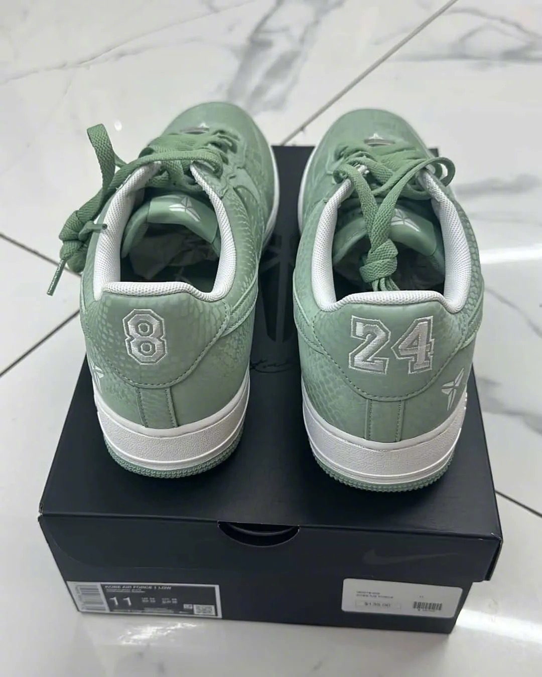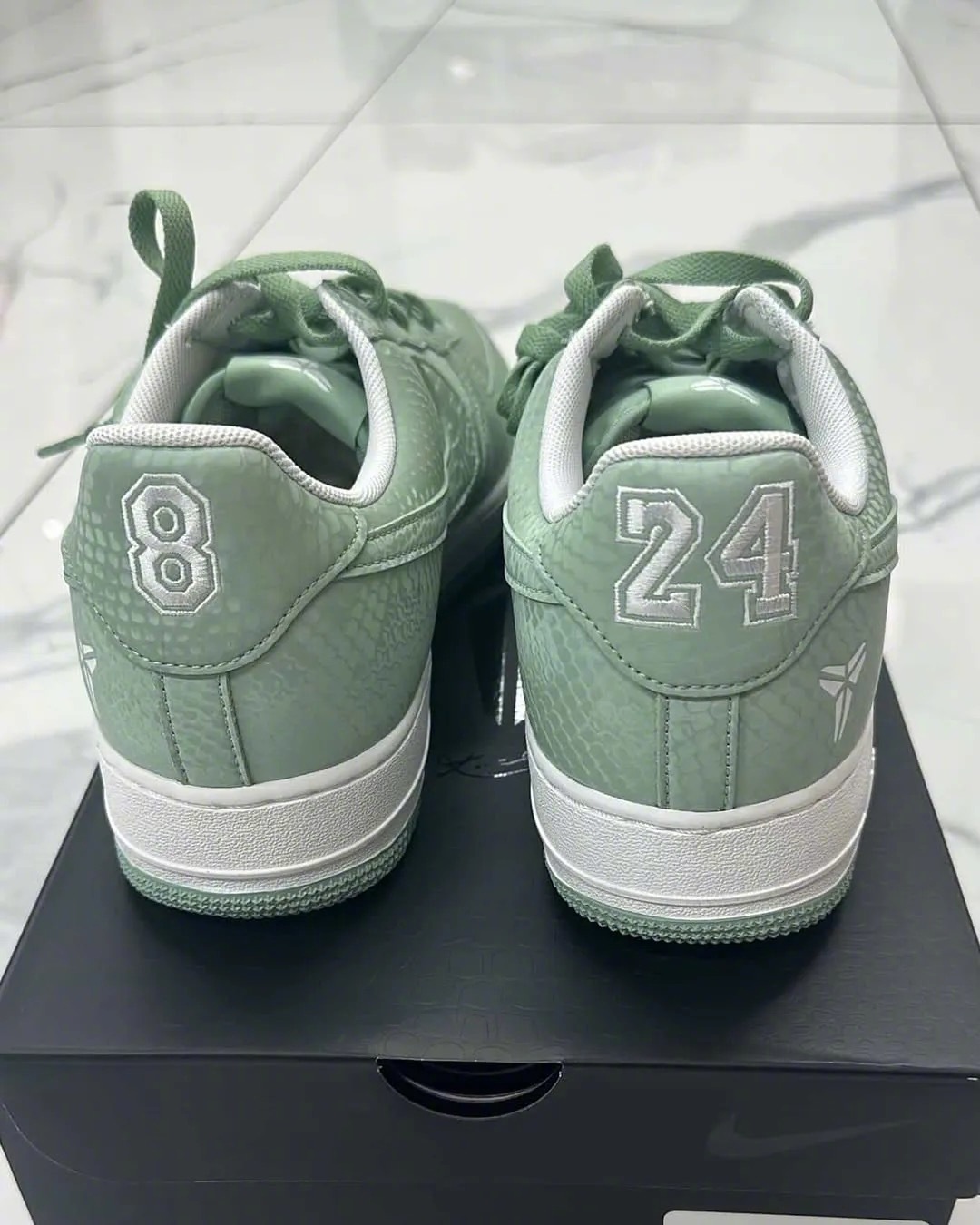 科比AF1新配色曝光,绿色蛇鳞纹鞋面,搭配白色「8」和「24」的背号刺绣🐍